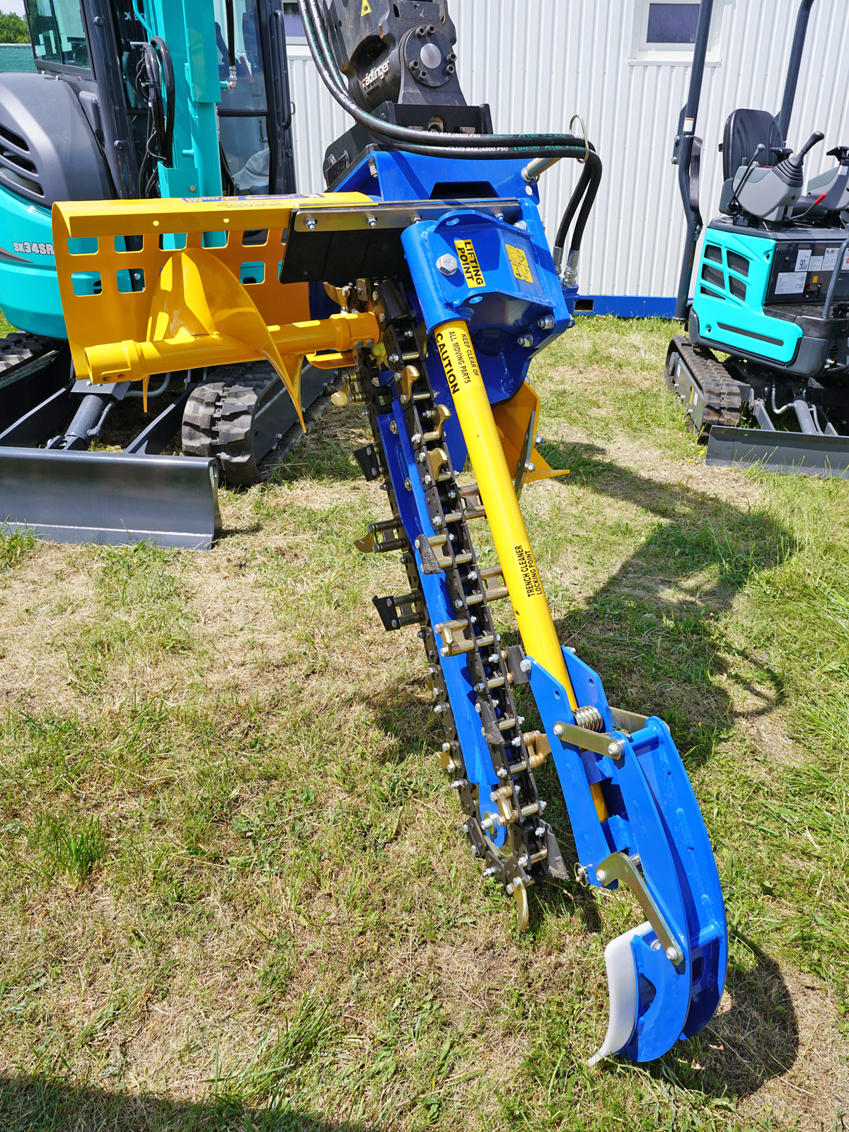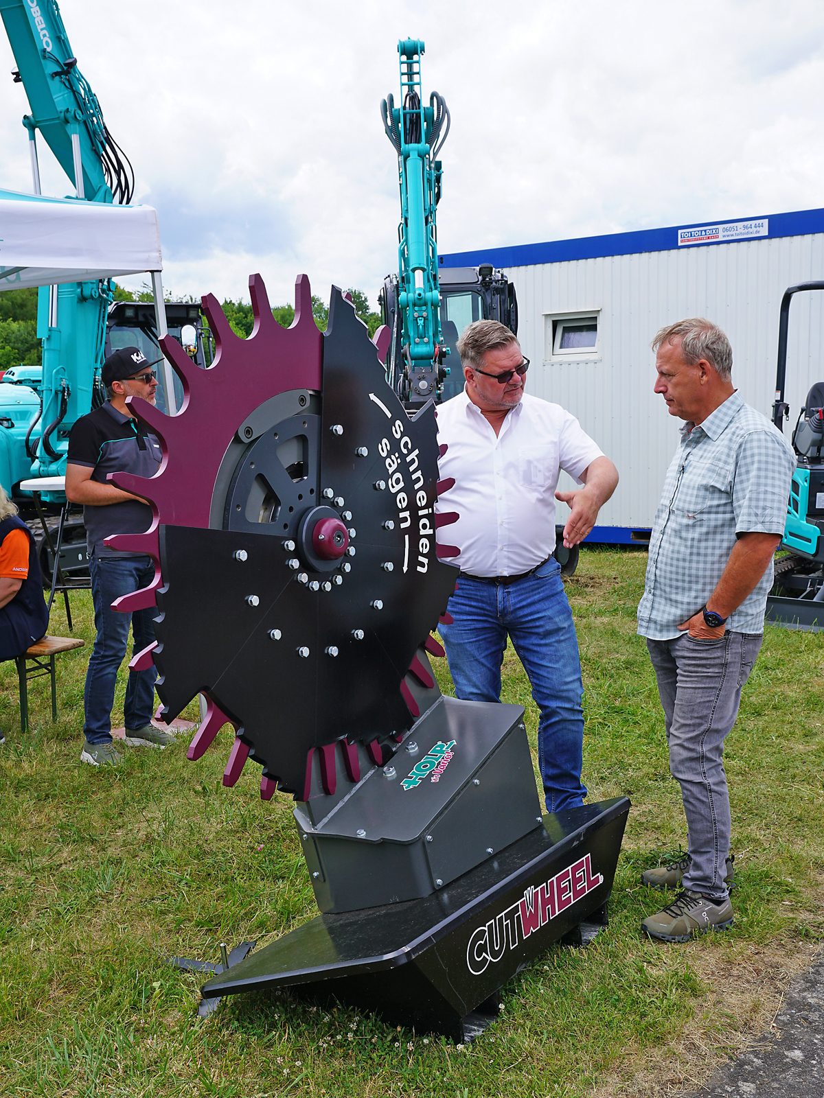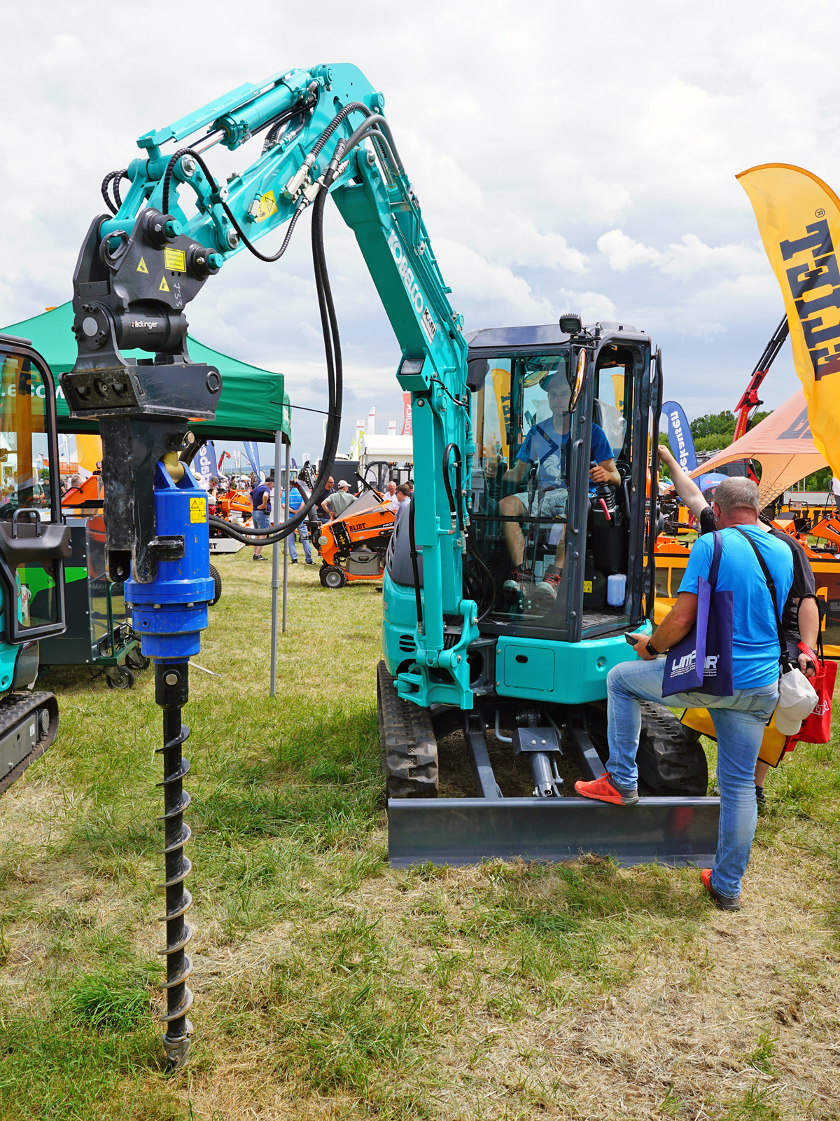 Die Vielseitigkeit der Kobelco-Bagger mit ihrer leistungsfähigen Hydraulikauslegung setzten RotoTop-Schnellwechsler und Anbaugeräte des süddeutschen Spezialisten Holp und aus dem Vertriebsprogramm der Herforder Andert Baumaschinen in Szene. Neben multifunktionalen Baggerlöffeln und Astscheren wurden auch leistungsfähige Erdbohrer und Anbaufräsen der britischen Kinshofer-Tochter Auger Torque präsentiert.