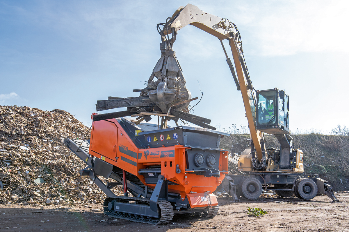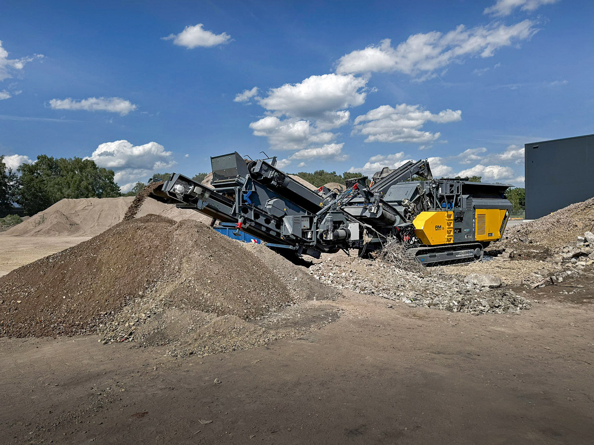 Rubble Master kann nach Ansicht von Kölsch »als der Erfinder einer eigenen Brechergattung gelten«. Die gelben, hochkompakten, mobilen Prallbrecher traten vor über 30 Jahren auf den Plan. In diesem Bereich sei Rubble Master nach wie vor marktführend. Der Maschinentyp »RM100« ist aktuell der meistverkaufte im RM-Portfolio. Kölsch zeigt mit der »RM100X« eine Maschine der neuesten Generation beim Einsatz in kontaminiertem Bauschutt. Speziell dafür ist sie mit einem Magnetabscheider und einem Windsichter ausgestattet. Der neue raupenmobile Prallbrecher besticht durch ausgefeilte Assistenz-Systeme, unübertroffene Anwenderfreundlichkeit, zahlreiche digitale Features und eine Optimierung von Bedienbarkeit, Technik und Aufbau. Die Steuerung erfolgt über einen komfortablen Touchscreen. Integriert sind zahlreiche neue Funktionen, ein Servicemodus und diverse Diagnosefunktionen. Die Servicezugänglichkeit des Motors wurde ebenfalls verbessert. Optimiert wurden zudem der Rotor und die Schlagleisten. Drei mächtige LED-Leuchten am Heck signalisieren, wie es um Auslastung und Output steht. Drei weitere farbige Leuchtelemente zeigen von außen an, ob die Maschine arbeitet (grün), sich im Wartungsmodus befindet (gelb), oder ob ein Fehler vorliegt (rot). Optimales Aufgabematerial vorausgesetzt, ist ein Maximaldurchsatz von bis zu 250 t/h erzielbar.