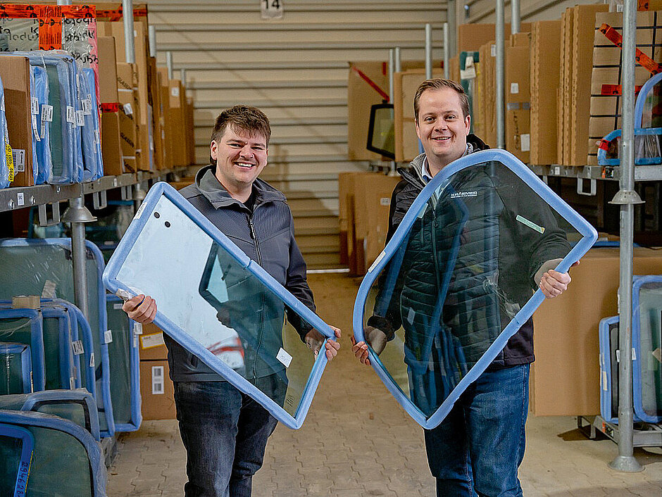Marvin Herbort, Leiter Ersatzteile, betont den Sicherheitsaspekt: »Eine beschädigte Scheibe bedeutet nicht nur Einschränkungen im Betrieb, sondern auch ein Risiko für Mensch und Maschine.« Aus diesem Grund stellt die Versorgung mit passenden Glasscheiben auch einen Beitrag zur Verantwortung gegenüber den Mitarbeitenden der Kunden dar. Um in diesem Bereich für die unterschiedlichsten Anfragen die jeweils passende Lösung liefern zu können, hat Kraemer Baumaschinen sein Sortiment systematisch aufgebaut.