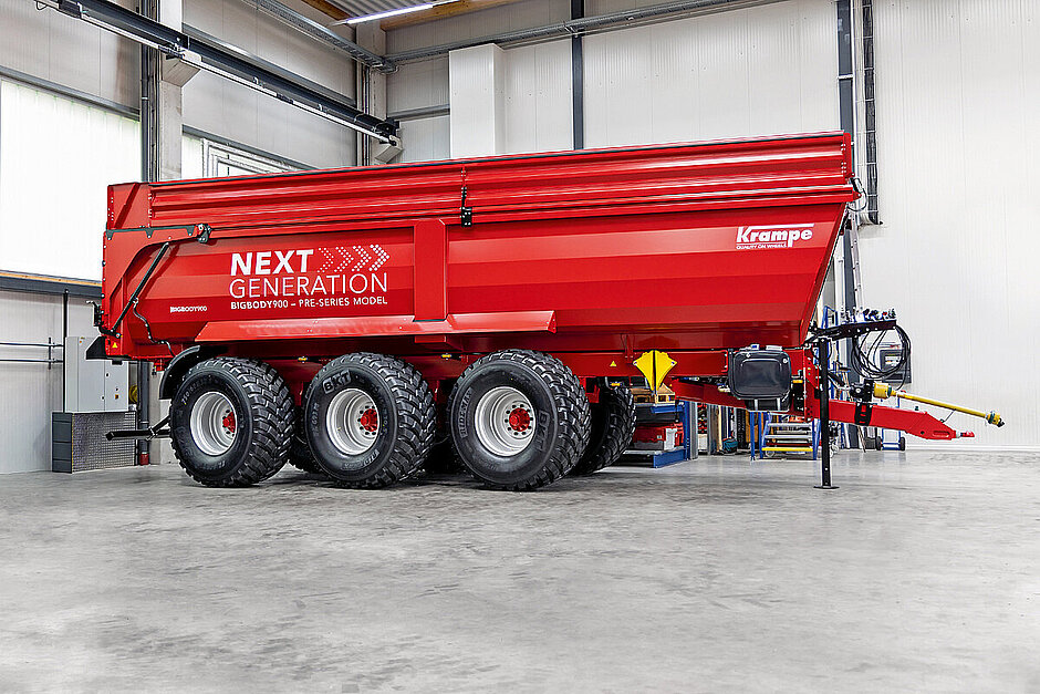 Zusammengefasst lässt sich festhalten, dass der »BigBody 900« über verschiedene Abdecksysteme und Aufsatzgrößen sowie eine geschlossene Bauweise für weniger Schmutzablagerung verfügt, was die Reinigung vereinfacht. Hinzu kommen hydraulisch klappbare Aufsätze mit integrierter Verriegelung, obenliegende Bremszylinder für maximale Bodenfreiheit sowie wahlweise Luft-, Hydraulik- oder Parabelfederung und optionale deichselgeberlose, elektrische Zwangslenkung mit drei gelenkten Achsen- und Lenkmodi. Wichtig ist außerdem: Die Lenkintensität und -richtung kann der Fahrer bequem aus der Kabine einstellen, optional lassen sich zudem eine Isobus-Steuerung und ein EBS-System nutzen. Der Tridem-Wannenkipper lässt sich im Übrigen auch mit optionaler Wiegeeinrichtung (±2 Prozent) mit App-Anbindung für Gewicht, Kilometer, Fuhrenzähler und Geschwindigkeit ausstatten.d