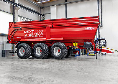 Die serienmäßige 10-t-Parabelfederung sorgt für hohe Wankstabilität, alternativ ist eine Luftfederung für einen erhöhten Fahrkomfort erhältlich.Die Fahrwerkshöhe lässt sich steckbar und damit nachträglich an verschiedene Radgrößen anpassen – so bleibt die Bodenfreiheit optimal, der Schwerpunkt niedrig und das Fahrverhalten sicher. Standardmäßig werden BPW-Achsen verbaut, in der 80-km/h-Version Gigant-Achsen. Eine frostsichere Edelstahldichtung zwischen Brücke und Bordwand schützt zuverlässig vor dem Austritt feinkörniger Güter. Die Schließwelle ist nachjustierbar. Markierungsleuchten, die direkt an der Brücke montiert sind, sollen für bessere Sichtbarkeit sowie weniger Schmutzanhaftung beim Be- und Entladen sorgen.