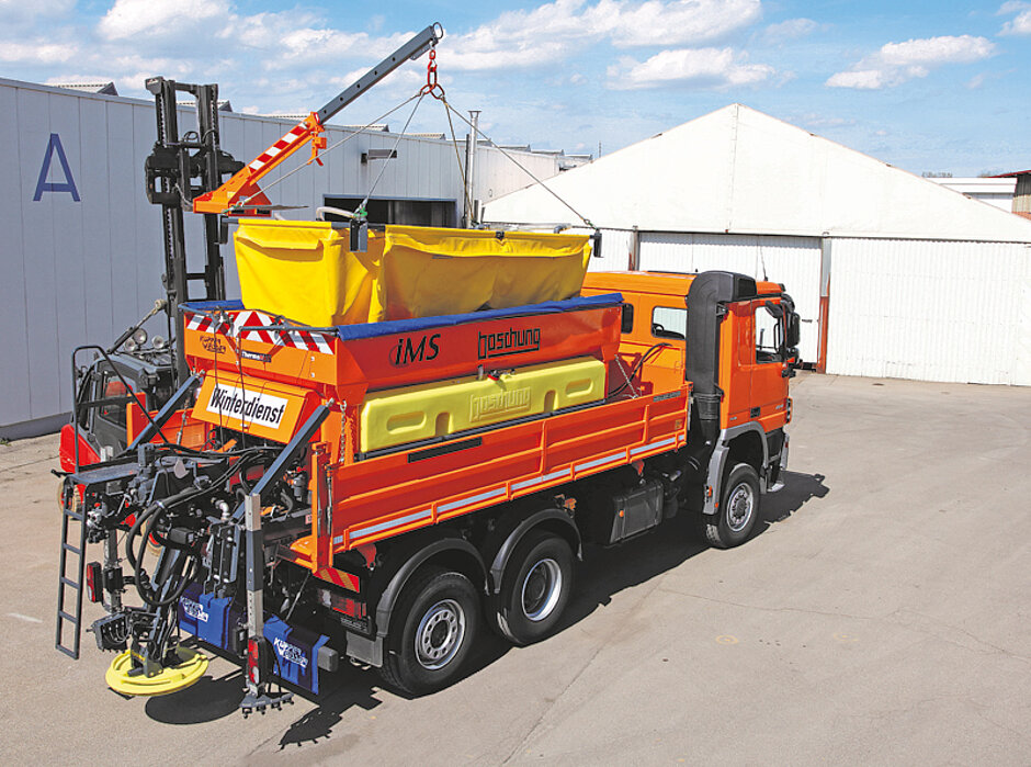 Hierbei wird ein flexibler und mit Sole befüllter Tanksack, bestehend aus hochreißfestem Kunststoff mit Gewebeverstärkung und einem stabilen Stahlrahmen, in den leeren Feststoffbehälter einer Streumaschine eingelassen und mit dem übrigen Solesystem des Streugeräts verbunden.