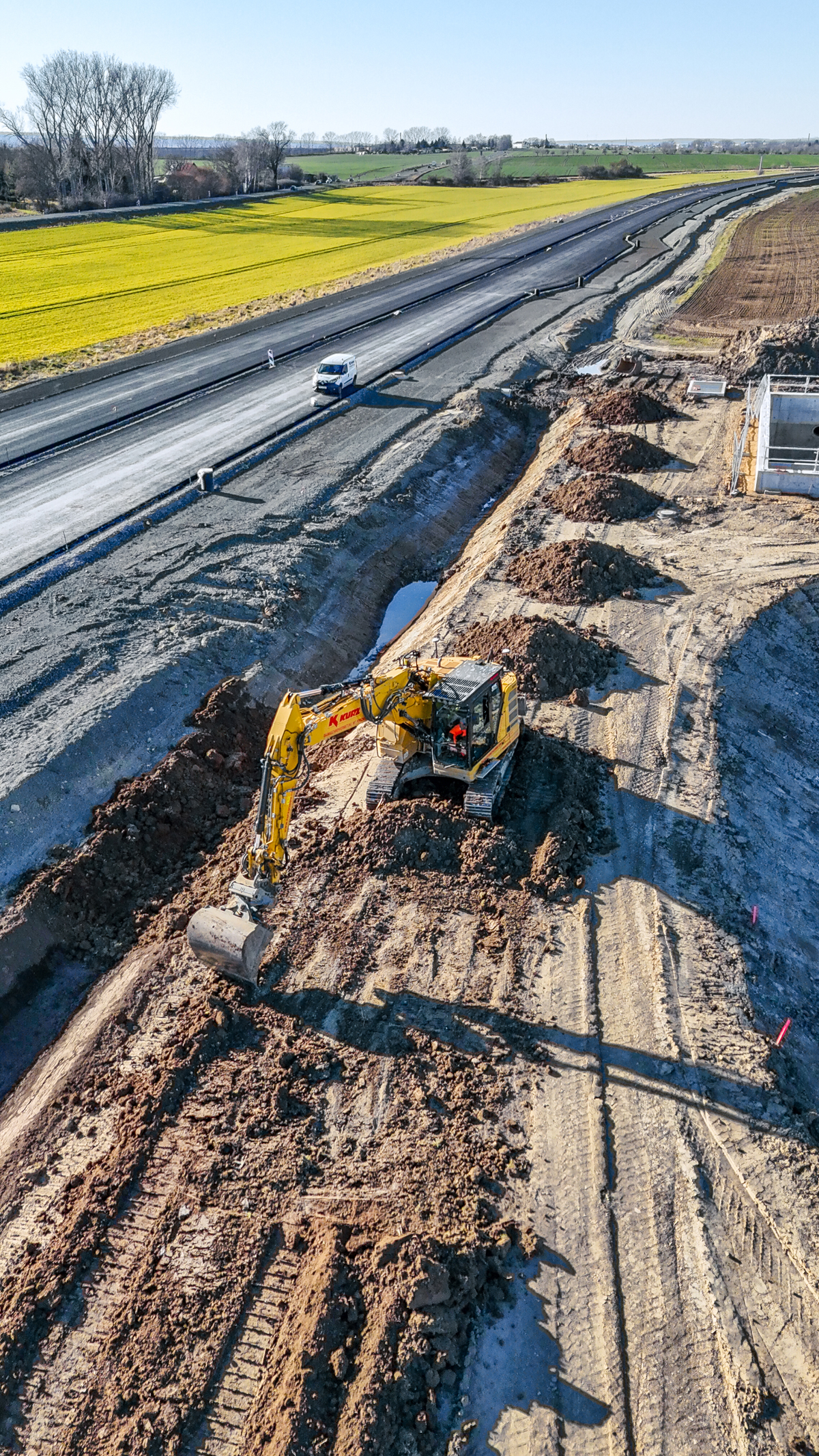Die eingesetzten Maschinen kommen in allen Bauabschnitten zum Einsatz – vom Erdbau über Kanal- und Straßenbau bis hin zur Entwässerung. Alle Geräte sind mit moderner 3D-Steuerung ausgestattet, was insbesondere bei der Umsetzung komplexer Entwässerungsmodelle für Präzision und Effizienz sorgt. Ergänzt wird das technische Konzept durch die enge Zusammenarbeit auf persönlicher Ebene: Der direkte Draht zwischen Vinci Construction GeoInfrastructure und Kurz ermöglicht schnelle Entscheidungen. So kann flexibel und zeitnah auf neue Anforderungen oder unerwartete Herausforderungen reagiert werden – ein Schlüsselfaktor für den Erfolg des Projekts. Trotz archäologischer Funde, Altlastenbeseitigung und wetterbedingter Herausforderungen entwickelt sich das Bauvorhaben insgesamt im vorgesehenen Rahmen. Die ursprünglich für Mitte 2025 geplante Fertigstellung verschiebt sich voraussichtlich auf Ende 2025. Mit dem Abschluss des Projekts wird eine deutliche Verbesserung der Verkehrsinfrastruktur in Mittelthüringen, Südniedersachsen und Nordhessen erwartet – insbesondere durch die Reduzierung des Durchgangsverkehrs in betroffenen Ortslagen und die Erhöhung der Verkehrssicherheit.