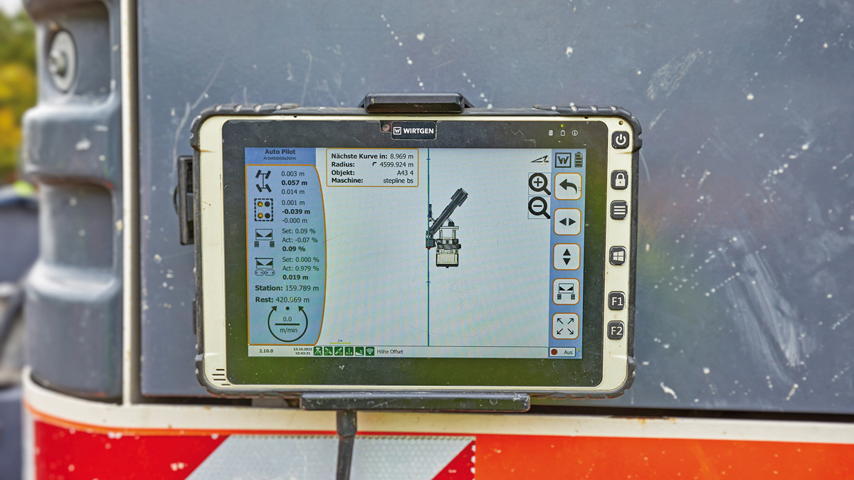 Wie auf Autobahn-Baustellen üblich, war auch auf der A 43 der Platz für das Einbauteam begrenzt. Ein Leitdraht vor der Maschine würde die Bewegungsfreiheit zusätzlich einschränken. Eben diesen suchte man hier vergebens. Es sei denn, man richtet seinen Blick auf das Display des AutoPilot-Tablets. Die portable Bedieneinheit zeigt den Verlauf des virtuellen Leitdrahtes an und gibt dem Bediener Informationen zu jedem einzelnen Punkt auf der definierten Strecke. Vor dem Gleitschalungsfertiger bleibt dadurch viel Freiraum. Eintreffende Fahrmischer können ungehindert rangieren und an die Maschine heranfahren. Für das Einbauteam bringt der freie Raum vor der Maschine nicht nur zusätzlichen Platz zum Arbeiten, sondern auch ein Mehr an Sicherheit. Für sie entfällt mit dem Leitdraht auch eine Stolperfalle.
