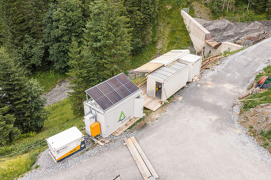 Eine der größten Herausforderungen bei der Planung einer Baustelle in einem so abgelegenen Gebiet ist die Energieversorgung. Oftmals ist die Netzversorgung vor Ort nicht ausreichend, um große Stromspitzen abzudecken, oder sie ist gar nicht erst vorhanden. In diesem Fall ist der Schnelleinsatzkran der größte Verbraucher auf der Baustelle. Üblicherweise würde man hierfür ein Dieselaggregat nutzen. Die Wildbachverbauung setzt jedoch auf eine andere Lösung: den mobilen Energiespeicher »LPO 100« von Liebherr.