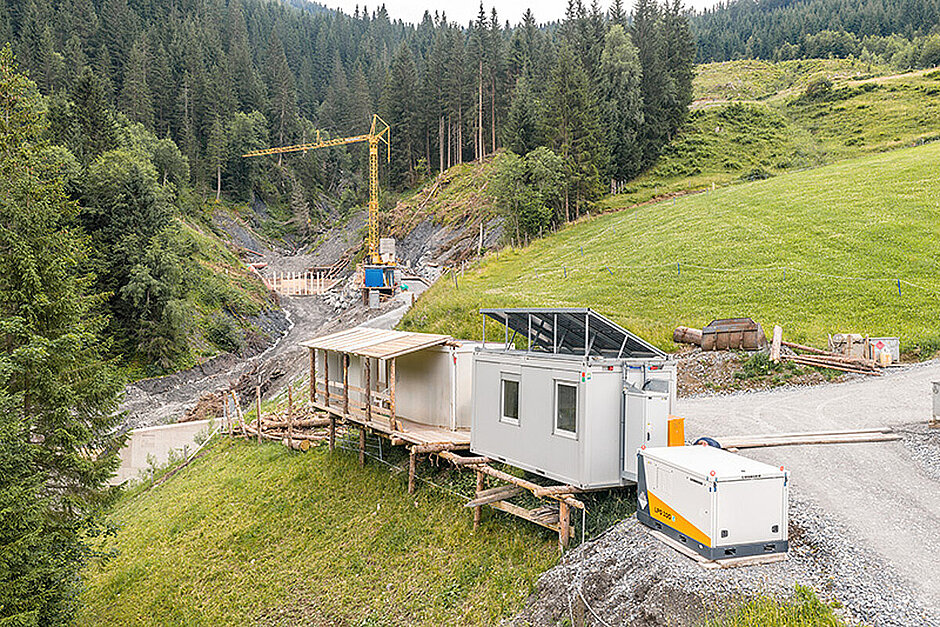 Die Österreichische Wildbach- und Lawinenverbauung stellt durch bauliche Schutzmaßnahmen die Prävention von Extremwetterereignissen wie Erdrutschen, Hochwasser oder Lawinenabgängen sicher und schützt somit die Bevölkerung. Zum ersten Mal setzt die lokale Behörde im Gebiet Pongau anstelle eines Dieselaggregats einen Liebherr-Energiespeicher zum Betrieb der Baustelle ein. Dadurch können pro Monat ca. 2.000 l Diesel eingespart werden – ein weiterer Schritt in Richtung nachhaltiges Bauen.