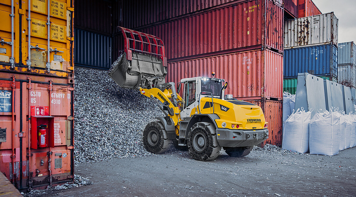Aus der Baureihe der mittelgroßen Radlader präsentiert Liebherr das Modell »L 546«. Dieses soll mit einem kraftvollen Hubgerüst mit Z-Kinematik überzeugen. Dadurch ergeben sich beim Materialumschlag schnelle Taktzeiten und dynamische Arbeitsbewegungen – auch mit schweren Anbauwerkzeugen wie Hochkippschaufeln im Recycling. Für Einsätze, die regelmäßig unterschiedliche Anbauwerkzeuge erfordern, gibt es einen sichtoptimierten Schnellwechsler sowie das vollautomatische Schnellwechselsystem »Likufix«. Der auf der Messe präsentierte »L 546« ist mit intelligenten Assistenzsystemen ausgestattet, wie einer aktiven Personenerkennung mit Bremsassistent und dem Kamera-System »Skyview«. Dieses erkennt Gefahrenquellen frühzeitig und warnt den Bediener mittels visueller und akustischer Signale.