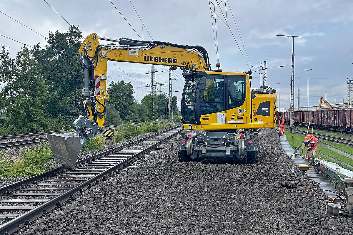 Für die Erd- und Gleisbauarbeiten kamen zwei Mietmaschinen der Liebherr-Mietpartner GmbH zum Einsatz: ein Zweiwegebagger »A 922 Rail« sowie eine Planierraupe »PR 716«, ausgestattet mit einer Leica-2D-Maschinensteuerung. Der »A 922 Rail« übernahm zunächst das Abziehen und Ausschachten des Planums im Bereich der neuen Weichen. Anschließend wurde mit der »PR 716« die Verlegeplanie millimetergenau hergestellt – ein entscheidender Schritt für die spätere Positionierung der Schwellen. Die Leica-Maschinensteuerung ermöglichte dabei eine exakte Höhen- und Lagegenauigkeit, die für den Einbau der Betonschwellen unerlässlich war. Nach Abschluss der Feinplanie wurde das Planum verdichtet, bevor der Zweiwegebagger von Liebherr erneut zum Einsatz kam: Er unterstützte beim Auflegen der Betonschwellen und bei der Montage des Gestänges auf dem neu hergestellten Untergrund.