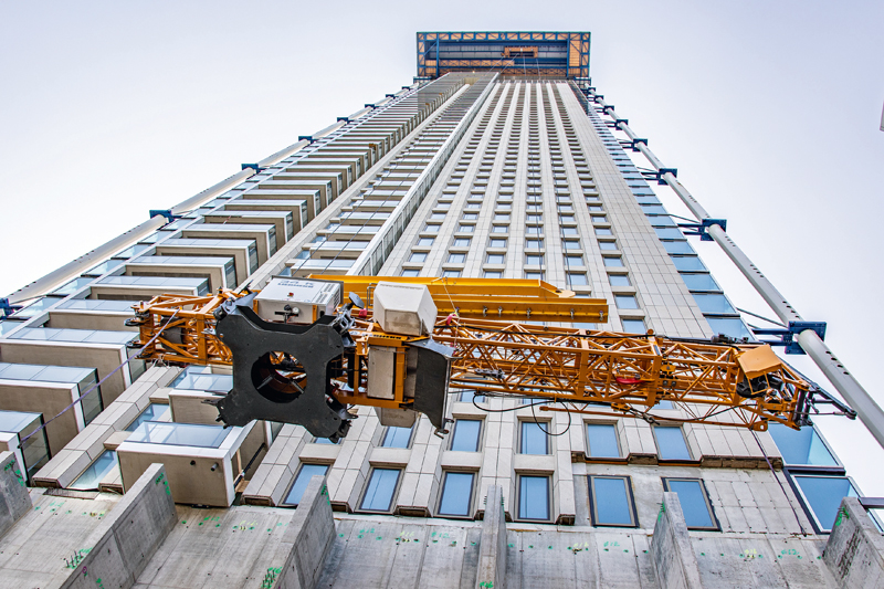 Auf dem Dach des künftigen Restaurants stand seit Mitte Juni ein Schnelleinsatzkran 34 K mit einer Hakenhöhe von 20 m. Seine Aufgabe in einer Höhe von 190 m war die Demontage eines Teils einer Hebebühne. Sie war für den Bau des »Zalmhaven I« benötigt worden. Die Hebebühne wuchs mit dem Turm Ebene um Ebene in die Höhe; quasi wie ein kletterndes Werk, in dem die Monteure so arbeiten konnten, als ob sie auf dem Boden stünden. Mit dem Konzept war die Baustelle am »Zalmhaven I« bislang ohne Turmdrehkran ausgekommen. Das hatte sich mit der Montage des 34 K, der via Funk gesteuert wurde, nun geändert.