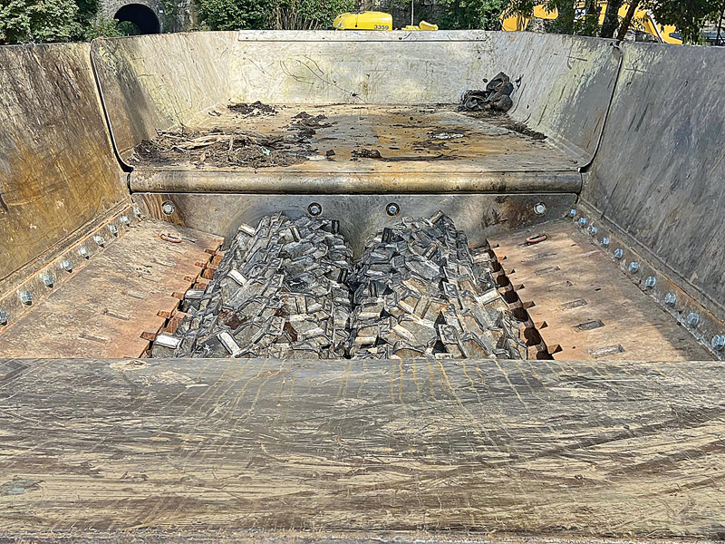 Das im Ahrtal eingesetzte System zeigte sich unempfindlich gegenüber Störstoffen im dortigen Treibholz. Neben Schlamm und Steinen waren auch Matratzen, Metallgitter und andere Gegenstände von den Fluten aus den Kellern und Wohnungen geschwemmt worden. Spezielle Einzugsreißer sorgen dafür, dass das Material mit maximaler Produktivität zerkleinert wird. Sie ziehen das Material mit Haken in den Rotor, um eine kontinuierliche Materialzufuhr und eine beständige Durchsatzqualität zu erzielen. »Das zu verarbeitende Material ist sehr speziell – stark durchnässt, verschlammt und mineralreich. Kraft- und leistungstechnisch ist das kein Problem für die Urraco. Wir schreddern mehr als 50 t/h Material«, so Martin Brinkschmidt. t