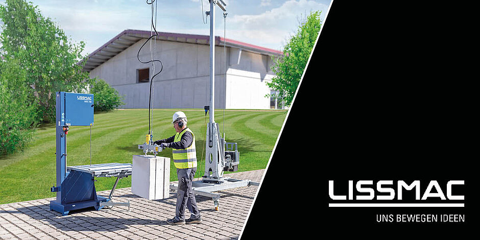 Für eine höhere Produktivität am Bau liefert Lissmac eine Kombination aus Minikran bzw. Steinmanipulator und Bandsäge, mit der sich die Schlagzahl beim Setzen von mittel- und großformatigen Mauersteinen beschleunigen und zugleich die Körperkraft schonen lassen sollen.