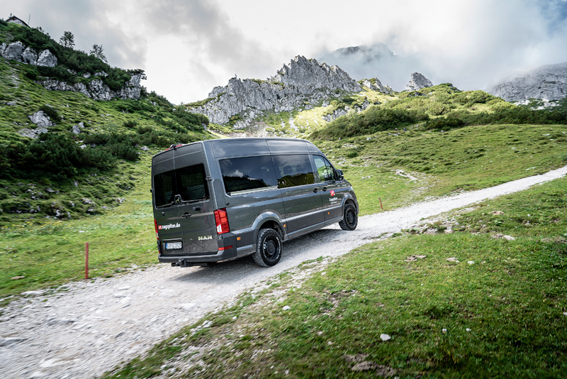 Jens Schulze, verantwortlich für die technische Lagerung und Logistik bei der Bayerischen Zugspitzbahn, äußert sich über den neuesten Fuhrparkzugang am Betriebswerk in Grainau: »Entscheidend für die Anschaffung dieses MAN TGE 4x4 war die enorme Antriebskraft des Allrads im steilen Gelände. Es ist schon beeindruckend, wie das intelligente Allradsystem arbeitet und den Transporter auch auf unbefestigten Wegen wie eine Gams den Berg hinaufzieht.«