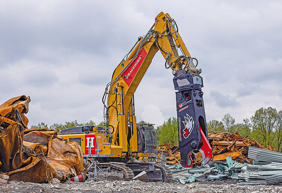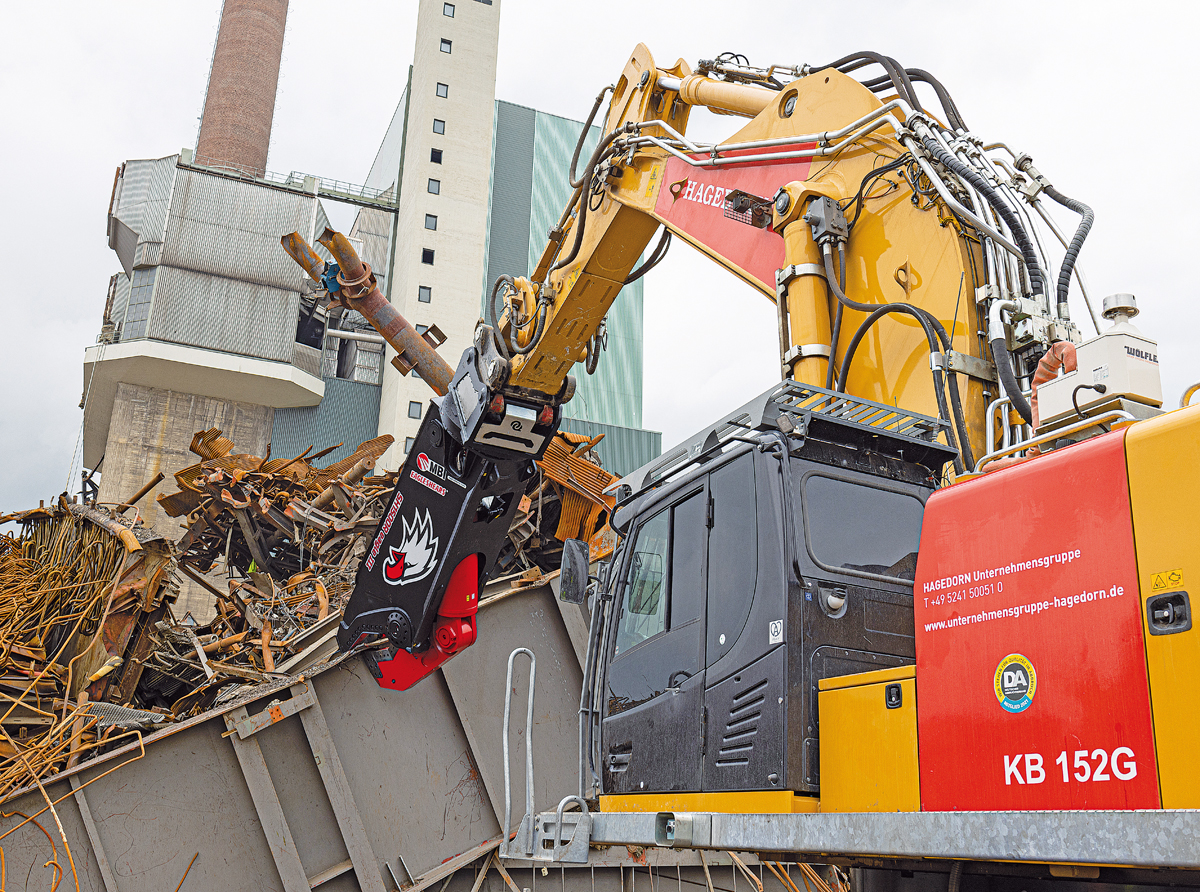 Ebenfalls bei Hagedorn im Einsatz ist der kleinere Bruder, die 7,7 t schwere Schrottschere vom Typ SH700R. Deutschlands größter Abbruchbagger bricht mit der 4 300 mm langen Maschine mit einer Öffnungsweite von 830 mm in einer Höhe von bis zu 36 m Gebäudeteile des Kraftwerks ab. Im Team werden die beiden MBI-Maschinen das Kraftwerk in Lünen in den kommenden Monaten zurückbauen und für die Rekultivierung sowie die Neubebauung vorbereiten. d
