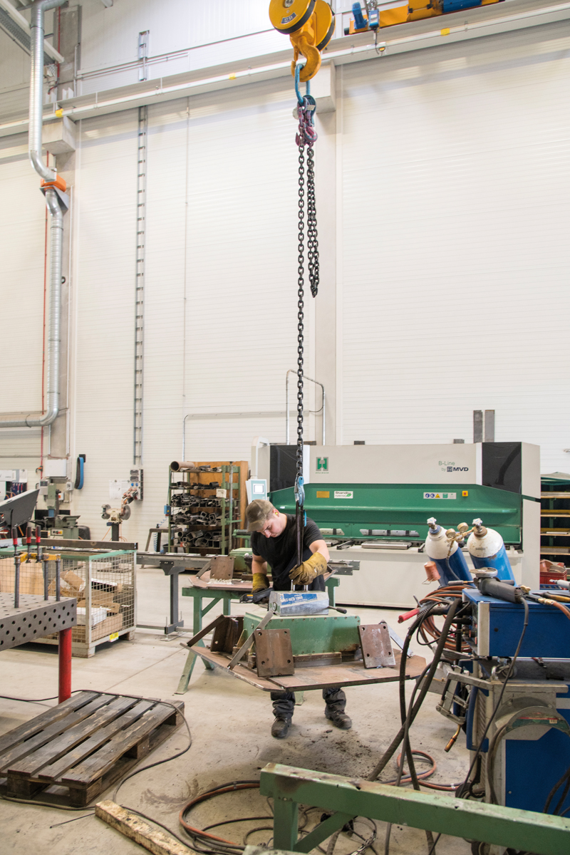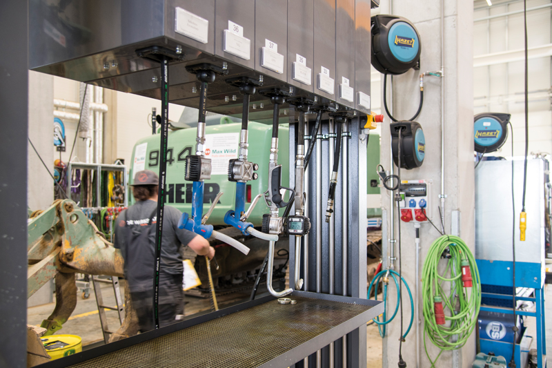 In dem 121 m langen, 42 m breiten und 13,5 m hohen Gebäudekomplex stehen auf insgesamt rund 6 400 m² diverse Werkstattbereiche mit Kranen, Hebebühnen und Gruben zur Verfügung, es gibt verschiedene Lagerflächen, eine Lackiererei, eine Schlosserei für Stahlarbeiten und eine Waschstraße sowie 1 120 m² an Bürofläche. »Die Kranlast beträgt bis zu 50 t«, so Florian Veit weiter. »Damit können auch die ganz schweren Fahrzeuge und Maschinen bewegt werden.«