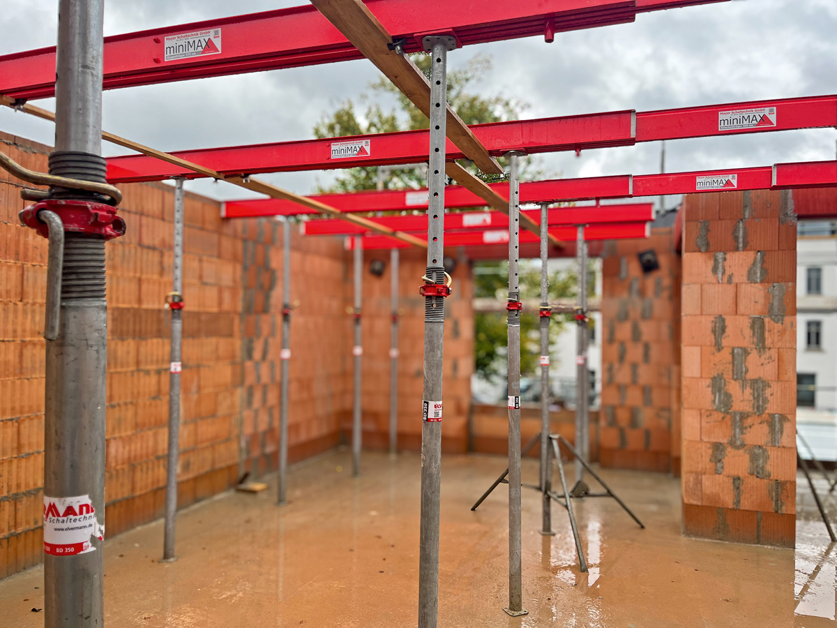 In jedem Stockwerk gilt es, knapp 500 bis 600 m² Deckenfläche zu schalen. Das Unternehmen Karl Roth setzt hierbei auf die Alu-Schalungsträger »miniMAX«. Hier überzeugt das System u. a. durch seine Wirtschaftlichkeit, die auf »rasanten Schalzeiten« sowie einer hohen Einsparung an Deckenstützen von 50 Prozent beruht. »Besonders beeindruckt hat mich das durchdachte und vorgegebene Raster für die Stützen bei den ›miniMAX‹-Trägern. Die Gestaltung eines Deckenschalungsplans war daraus resultierend schnell und mühelos per Hand möglich«, nennt der zuständige Polier Josef Burger weitere Vorteile. Auch der Aufbau des Systems sei zügig durchführbar. »Aufgrund des leichten Gewichts der Träger konnten unsere örtlichen Baustellenkräfte äußerst schnell und körperschonend arbeiten«, so Burger weiter.