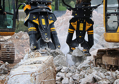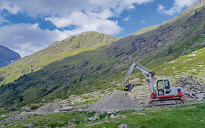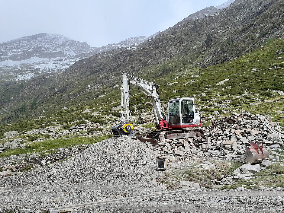 »Direkt vor der Haustür beginnt der Naturpark Texelgruppe«, so Florian Pichler, und weist auf die damit verbundene Aufgabe hin: »Die Wege und Pfade für Wanderer, Gäste und landwirtschaftlichen Fahrzeuge müssen nach dem Wegtauen des Schnees wieder begeh- bzw. befahrbar sein.« Um dies zu gewährleisten, wird mit dem eigenen Takeuchi »TB 175« regelmäßig das Geröll eingesammelt, welches sich rund um seinen Hof sowie auf der Alm und den Weiden für Rinder, Schafe und Ziegen ansammelt. Größere Steine werden zunächst mit einem am Takeuchi-Bagger angebrachten Steinhammer zerkleinert.
