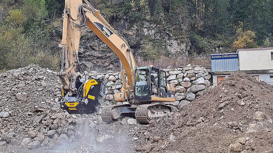 Die Vecellio Costruzioni AG – eine Hoch- und Tiefbaufirma aus dem Kanton Graubünden in der Schweiz, sah sich immer wieder mit dem Problem der mangelnden Kapazität an Lagerflächen konfrontiert. In der Vergangenheit wurde ein Brecher angemietet, um die gesammelten Steinreste zu bearbeiten. Dafür benötigte man aber eine große Lagerfläche, damit sich die Anmietung rentiert. Die Lösung für dieses Problem wurde anscheinend mit dem MB-Crusher-Backenbrecherlöffel »BF 80.3« gefunden.