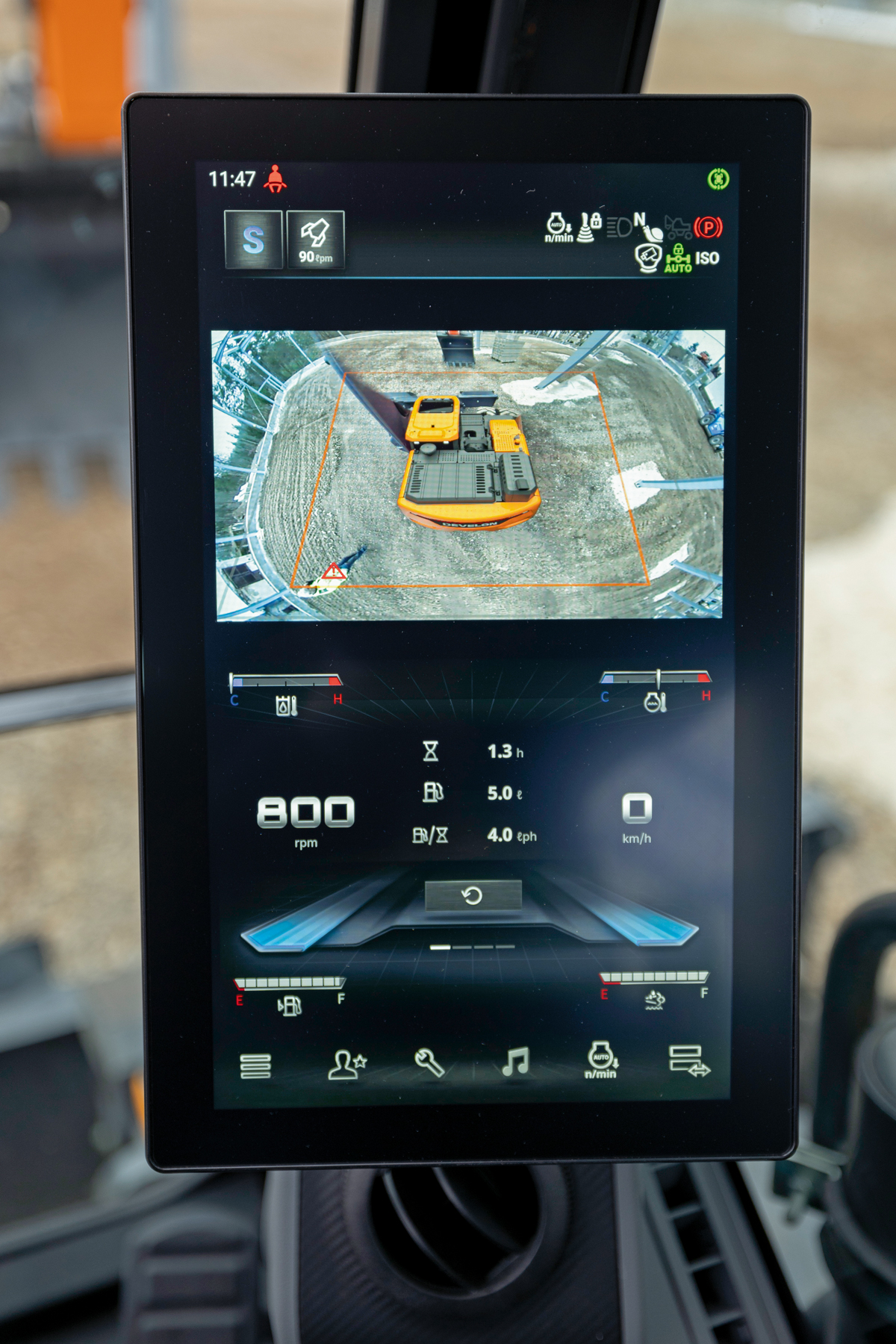 Zur Erfüllung der Sicherheitsnorm EN474:2022 wird während des Betriebs der Maschine unabhängig vom Fahr- oder Arbeitsmodus stets eine Ansicht nach hinten/rechts angezeigt, sofern die Kamera eine solche liefert. Eine Option für Kameraansicht zur Seite/nach hinten sorgt dafür, dass beide Kamerabilder stets gleichzeitig sichtbar sind, egal ob in Halb- oder Vollansicht. Außerdem ist ein neuer Smart-All-Around-Viewing-Monitor (SAVM) vorhanden, der gemäß EN474 die Draufsicht stets zusätzlich anzeigt, wenn die Ansichten »Hinten«, »Rechts« und »Rechte Ecke« ausgewählt sind. Der Begriff »Smart« weist auf die verbesserte AVM- Spezifikation hin, die sich zusätzlich durch eine Personenerkennung – zur Erhöhung der Sicherheit – auszeichnet. Mithilfe von vier Kameras werden Arbeiter in der Umgebung der Maschine auf der Baustelle erkannt, was über die vorhandene Spezifikation der AVM-Option hinausgeht.