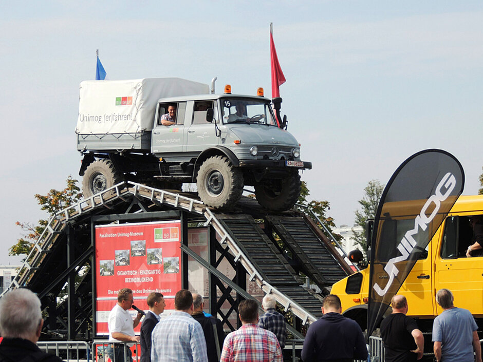 Auf der Nutzfahrzeugmesse ist auch die Unimog-Sparte gut vertreten. Die Knoblauch GmbH aus Immendingen, Unimog-Generalvertretung, bringt mehrere Modelle der Baureihe Unimog-Geräteträger nach Karlsruhe, darunter einen Unimog U 530 für den Winterdienst, einen Unimog U 218 mit Abrollcontainersystem sowie einen Unimog U 430 als Agrarfahrzeug.