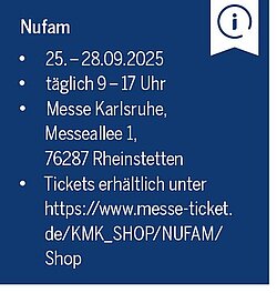 Seit vielen Jahren ist die Nufam auch ein wichtiger Treffpunkt für Gemeinden und Kommunen. Denn neben Fahrzeugen für den Bau und das Transportwesen werden im Bereich »Treffpunkt Kommunal« aktuelle und neue Lösungen für den kommunalen Bedarf gezeigt. Fuhrparkleiter, Anwender sowie Vertreter privater Ver- und Entsorgungsbetriebe können sich direkt über die Bandbreite in diesem Bereich informieren, wie etwa große Lastwagen bis hin zu klimafreundlichen Straßenfahrzeugen für den Einsatz in Städten. Die Nufam will Interessierten in diesem Bereich einen echten Mehrwert bieten, u. a. mit einer geführten Kommunal-Tour. Diese ist ebenfalls kostenlos über den Ticketshop buchbar.