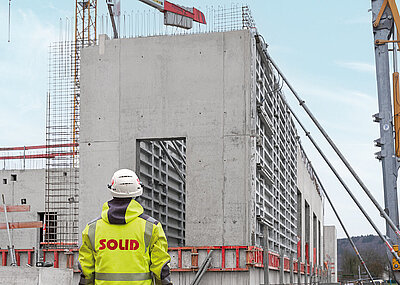 Eine Stärke der Mammut 350 soll bei dem Gebäude besonders zur Geltung kommen: Dank des symmetrischen Anker- und Fugenbildes der Schalelemente, stehend wie liegend, konnten die Oberflächen nach ästhetischen Gesichtspunkten gestaltet werden. Die Schalhaut mit der serienmäßig integrierten Alkus-Vollkunststoffplatte gewährte während der gesamten Bauzeit und an allen Wänden ein homogenes Erscheinungsbild der Sichtbetonoberflächen. Darüber hinaus erwiesen sich die einfache Reinigung und Ausbesserung der Alkus-Platte als zeitsparende Vorteile.