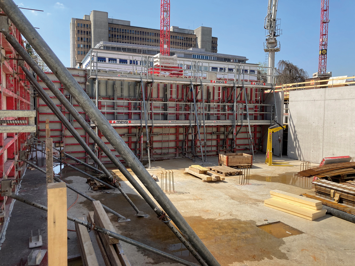 Für den Bau der Wände mit Geschosshöhen bis zu 5,30 m setzte Marti ein Schalungssystem von Meva ein, das sich bereits in zahlreichen Projekten des namhaften Bauunternehmens bewährte. Die leistungsstarke Wandschalung Mammut 350 mit vollflächiger Frischbetondruckaufnahme von 100 kN/m² ermöglicht kurze Betonierzeiten bis 4 m Höhe und schnellen Baufortschritt. Die einfache Einrichtung mit mehreren Eckkonfigurationen für eine Reihe von Grundrissen beschleunigt die Arbeiten ebenfalls.
