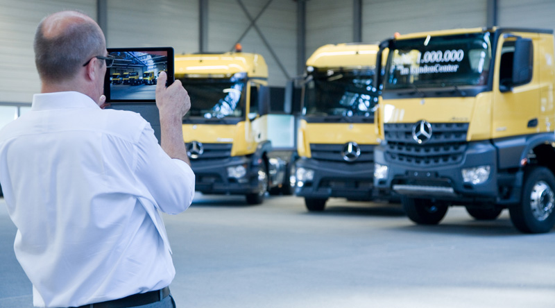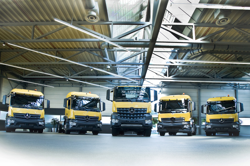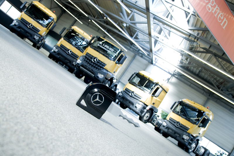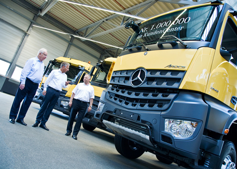 Heute hat das millionste Fahrzeug das KundenCenter des Mercedes-Benz Werkes in Wörth verlassen. Hier übergab Stefan Buchner, Leiter Mercedes-Benz Lkw, neben vier Mercedes-Benz Actros 1843 LS Sattelzugmaschinen das Jubiläumsfahrzeug, einen Arocs 3543 K 8x4/4, an seinen zukünftigen Besitzer Günter Papenburg, Inhaber der GP Günter Papenburg AG.