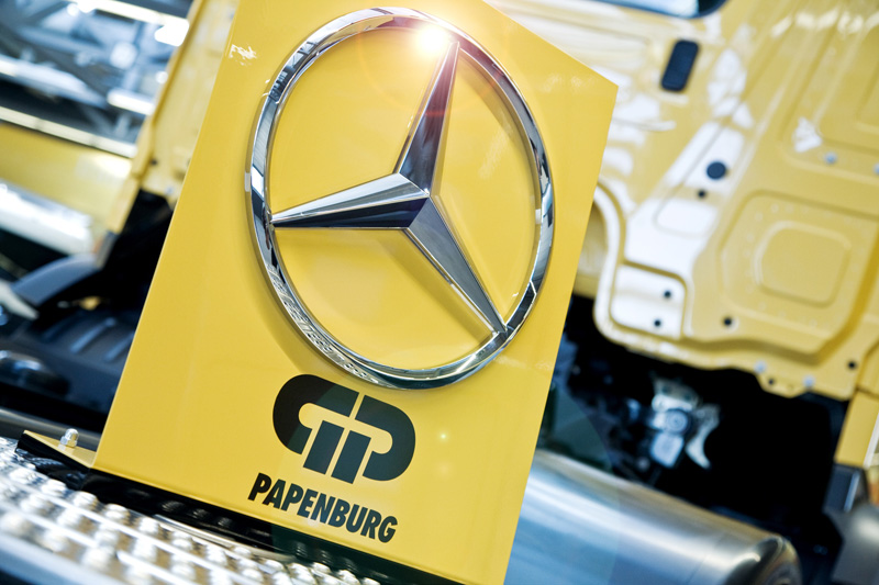 Der inkagelbe Arocs wird künftig im Baustellenverkehr in Deutschland unterwegs sein. Die Fahrmischerbetonpumpe wird überwiegend dort eingesetzt, wo es für eine große Betonpumpe unzugänglich ist wie beispielsweise in engen Gassen oder in Baulücken. Die Fahrmischerbetonpumpe hat den Vorteil, dass sie ihren Beton gleich mitbringt, alternativ aber auch nur als Betonpumpe benutzt werden kann. Ausgestattet ist der Arocs mit einem Reihensechszylindermotor OM 470 mit 10,7 l Hubraum und 315 kW (428 PS). Zudem setzt die Fa. Papenburg auf die digitalen Dienste der Daimlertochter Fleetboard und nutzt diese unter anderem zur Erfassung und Auswertung der Fahrzeugdaten. Auftragsübermittlung und Navigation erfolgen über das herausnehmbare Fahrer-Tablet DispoPilot.guide, mit dem der Arocs ebenfalls ausgestattet ist.