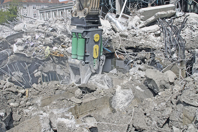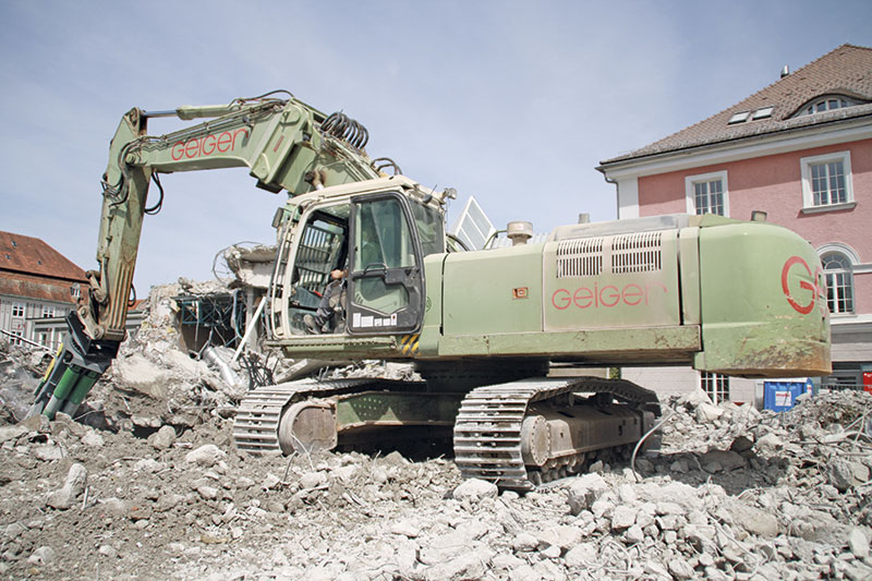 Beim Sparkassen-Abbruch im Allgäu setzte das aus der Region stammende Unternehmen Wilhelm Geiger das Demolator-Modell XMB 3.7 mit Bionic-Gebiss an einem Hitachi-Bagger des Typs ZX350LC-5 ein. Geiger-Maschinist Alexander Hehle zeigte sich von der Leistung des Demolators positiv überrascht: »Trotz viel Armierung in den 50 cm starken Tresorwänden der Bank gab es keine Probleme. Ist viel Eisen im Spiel, dann ist der Demolator mit Sicherheit eine echte Alternative zu herkömmlichen Anbaugeräten.«