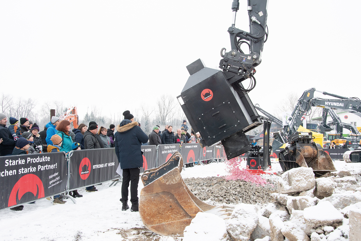Vertreten waren außerdem über 200 SkanCraft Anbaugeräte, die für jegliche Einsatzzwecke konzipiert wurden und in der Ausstellung unter die Lupe genommen werden konnten. Als echter Besuchermagnet erwies sich die Demofläche: SkanCraft stellte die Leistungsfähigkeit seiner Werkzeuge unter Beweis und führte unter anderem Hydraulikhämmer, Abbruchscheren, Hydraulikmagnete und Backenbrecherlöffel vor. Als Highlight durfte ein neu entwickelter Isolierstoffsauger begutachtet werden, der zum Absaugen von Isolierstoffen auf Abbruchbaustellen zum Einsatz kommt.
