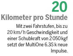 »Die Resonanz war bislang so stark, dass der MultiOne 6.3S k bereits jetzt im Frühjar auf dem deutschen Markt zur Verfügung steht. Mit zwei Fahrstufen, bis zu 20 km/h Geschwindigkeit und einer enormen Schubkraft von 2 050 kgf setzt der MultiOne 6.3S k neue Impulse auf dem Kompaktlader-Markt«, ist Thomas Sterkel überzeugt. Im Vergleich zum bisherigen Modell – dem 6.3+ K – bietet der Neue damit eine um satte 11 km/h gesteigerte Höchstgeschwindigkeit. Extrem kompakte Abmessungen und eine Hubkraft von mehr als 1,1 t machen die neue Maschine zu einem Multifunktionslader, der spielerisch schwere Arbeiten bewältigt und dabei kompakt genug ist, um problemlos, auch seitlich auf Lkw oder Anhänger verladen, zur Baustelle transportiert zu werden.