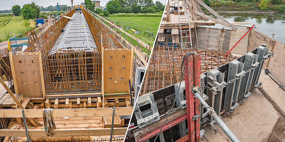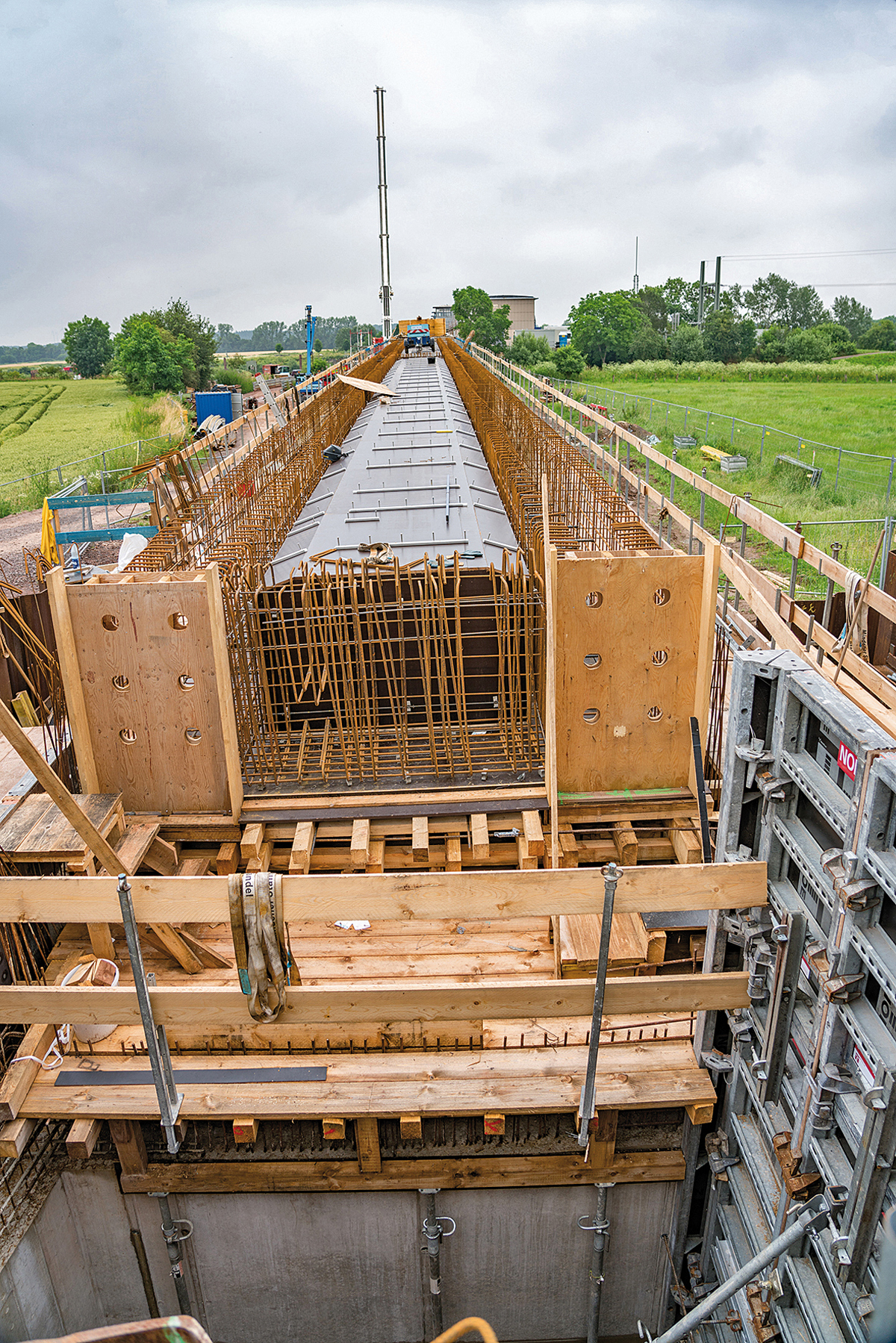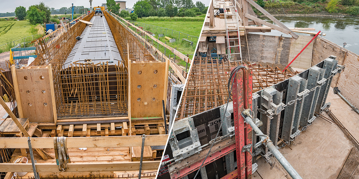 Ähnlich anspruchsvoll war der Bau von Strompfeiler 6, denn auch für ihn war eine Sonderschalung erforderlich. Da Spezialanfertigungen immer Zusatzkosten bedeuten, strebte man an, die Sonderkonstruktion gleich mehrfach zu verwenden und dabei den Bauablauf nicht zu stören. Infolgedessen entschied sich das Bauunternehmen Ludwig Freytag auch hier für eine Kombination aus NOEtop XXL und Sonderanfertigung. Doch im Gegensatz zu Pfeiler 5 wurde hier der gesamte Pfeilerquerschnitt auf einmal geschalt und betoniert – aber nicht in voller Höhe. Zunächst errichteten die Baustellenmitarbeiter den unteren Teil des Pfeilers, warteten, bis dieser ausgehärtet war, und hoben dann die Kombination aus Standard- und Spezialschalung an, um auch den oberen Teil zu betonieren. So war es auch hier möglich, mithilfe einer »halben Schalung« den kompletten Baukörper zu errichten und dabei Geld zu sparen. Eine weitere Herausforderung war der Brückenüberbau mit 5 m breiter Fahrbahnplatte. Genutzt wurde eine vorgespannte Brücke mit π-förmigem Querschnitt, der mit NOE Alu L hergestellt wurde.t
