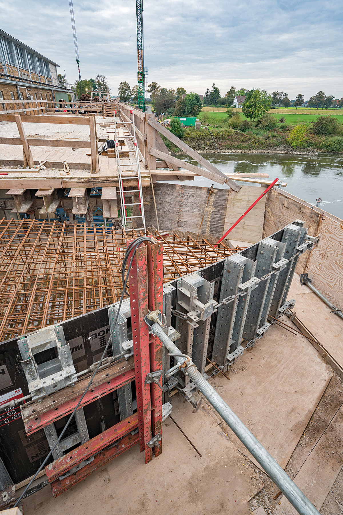 Bis Ende des Jahres wird in Intschede eine knapp 380 m lange Straßenbrückenanlage saniert, das ursprüngliche Bauwerk über die Weser war im Laufe der Zeit baufällig geworden. Doch die örtlichen Voraussetzungen stellen alle Beteiligten vor große Herausforderungen. Dies zeigt sich schon daran, dass es sich eigentlich um drei Bauwerke handelt: eine Wehr-, eine Kraftwerks- und eine Flutbrücke. Die Wehrbrücke ist über 165 m lang und dient wie die Kraftwerksbrücke dazu, die Weser zu überqueren. Wobei die Kraftwerksbrücke eine Länge von mehr als 35 m hat und parallel zu einem Turbinenhaus für die Stromgewinnung verläuft. Mithilfe der rund 179 m langen Flutbrücke soll die Fahrbahn auch bei Hochwasser genutzt werden können. Das gesamte Bauwerk ruht auf neun Pfeilern und zwei Widerlagern, die ebenfalls als Pfeiler gezählt werden. Sämtliche anfallenden Arbeiten werden von dem Oldenburger Bauunternehmen Ludwig Freytag übernommen. Dies begann zunächst damit, den Bestand außer Pfeiler 2, 3 und 4 abzubrechen. Denn bei jenen wurden lediglich die Pfeilerköpfe abgetragen, um die Lagersockel für die neuen Brückenlager zu fertigen. Als es daranging, die tragenden Elemente neu zu errichten, stellten insbesondere Pfeiler 5 und 6 die Baubeteiligten vor große Herausforderungen.