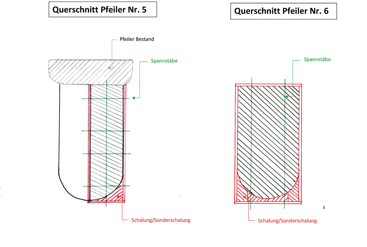 Da bereits im Bestand nicht nur die Fahrbahn, sondern auch der tragende Pfeiler 5 mit einer Raumfuge versehen war, musste diese auch beim Neubau erstellt werden. Eine knifflige Aufgabe, weist doch der Baukörper eine Grundfläche von 3,2 m x 5,5 m und als Strompfeiler mit 10,3 m ebenso eine beachtliche Höhe auf. Hinzu kam, dass der neue Pfeiler auf dem alten Fundament errichtet werden sollte, dessen Oberfläche eine Neigung von ungefähr 20° hatte.