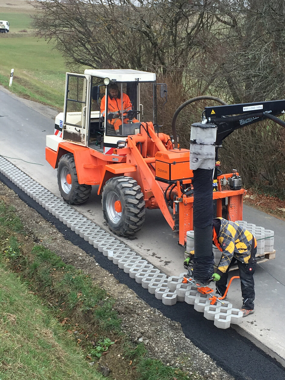 Auf die Planie wurden in Lautertal anschließend mit einem ebenfalls am Radlader montierten Optimas Vacu-Lift Rasengittersteine gesetzt. Das Anbaugerät saugt durch ein in seinem Schlaucharm erzeugtes Vakuum die zu verlegenden Steine oder Platten an. Körperliche Arbeiten können hier entfallen. Der Vacu-Lift wird an die Hydraulik des Radladers angeschlossen. An den Vakuum-Schlauchheber sind verschiedene Saugplatten und auch eine Greifzange ansetzbar. Mit einem einfachen Schnellwechselsystem sind sie binnen Sekunden austauschbar.