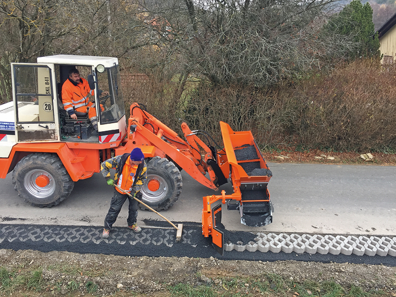 Weil der Vacu-Lift mit einer Saugplatte samt mechanischer Zange ausgerüstet ist, kann man die Gittersteine fassen und sie dann mit der Kraft des Vacu-Lifts und dessen Auslegerarm ohne eigenen Kraftaufwand verlegen. Anschließend war in Lautertal die Finliner gefragt, nun zusätzlich mit einem Gummischild ausgerüstet. Damit war es möglich, die Rasengittersteine mit einer 0/20-Mineralbetonmischung zu befüllen, ohne dass überflüssiges Material auf die Steine gelangt. Die gesamte Baumaßnahme lief schneller als mit einer herkömmlicher Baumethode ab.