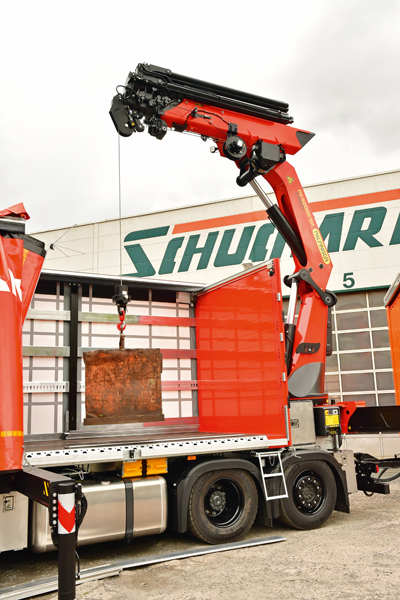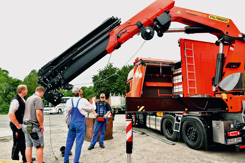 Der zur schweren Kranreihe gehörende Ladekran PK 42002 SH wird laut Palfinger vielfach wegen der hohen Leistung, seinen Sicherheitsmerkmalen und der Servicefreundlichkeit geschätzt. Das Endlosschwenkwerk ermöglicht einen uneingeschränkten Bewegungsbereich, »Power Link Plus« gewährleistet zudem einen vielseitigen Einsatz auch unter schwierigsten Bedingungen, etwa durch niedrige Türöffnungen oder in Gebäuden. Gerade beim Be- und Entladen eines Lkw sowohl von der Seite als auch von oben ist es vorteilhaft, auch bei einer großen Reichweite von bis zu 20 m hohe Lasten heben zu können. Zu den Pluspunkten zählen auch »Soft Stopp«, das HPSC für eine optimale Stützenposition, S-HPLS für gesteigerte Hubkraft, die aktive Schwingungsdämpfung AOS sowie DPS Plus im Fly-Jib-Betrieb.