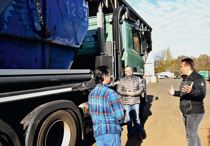 Dank des permanenten Dialogs der Vertriebsspezialisten mit den Kunden, kennt Palfinger deren Anforderungen und Bedürfnisse. Auf dieser Basis wurde auch dem Kölner Recycling-Profi die Investition in ein Gerät der neuesten Generation empfohlen. Auf einem Dreiachs-Chassis wurde der Absetzkipper PS T18 TEC mit Dreifach-Kipphaken und hydraulischer Behälterverriegelung verbaut. Giuseppe Di Mauro, Stammfahrer des Palfinger-Absetzkippers, ist seit zehn Jahren beim Kölner Entsorgungsbetrieb beschäftigt und schätzt die Bedienerfreundlichkeit und Sicherheit des neuen Palfinger-Geräts: »Das Handling ist ok, er ist schneller als sein Vorgänger und ich kann alle Funktionen auch mit der intuitiven Funkfernsteuerung nutzen. Der Absetzkipper lässt sich genauso bewegen, wie es meine Arbeit gerade erfordert.«
