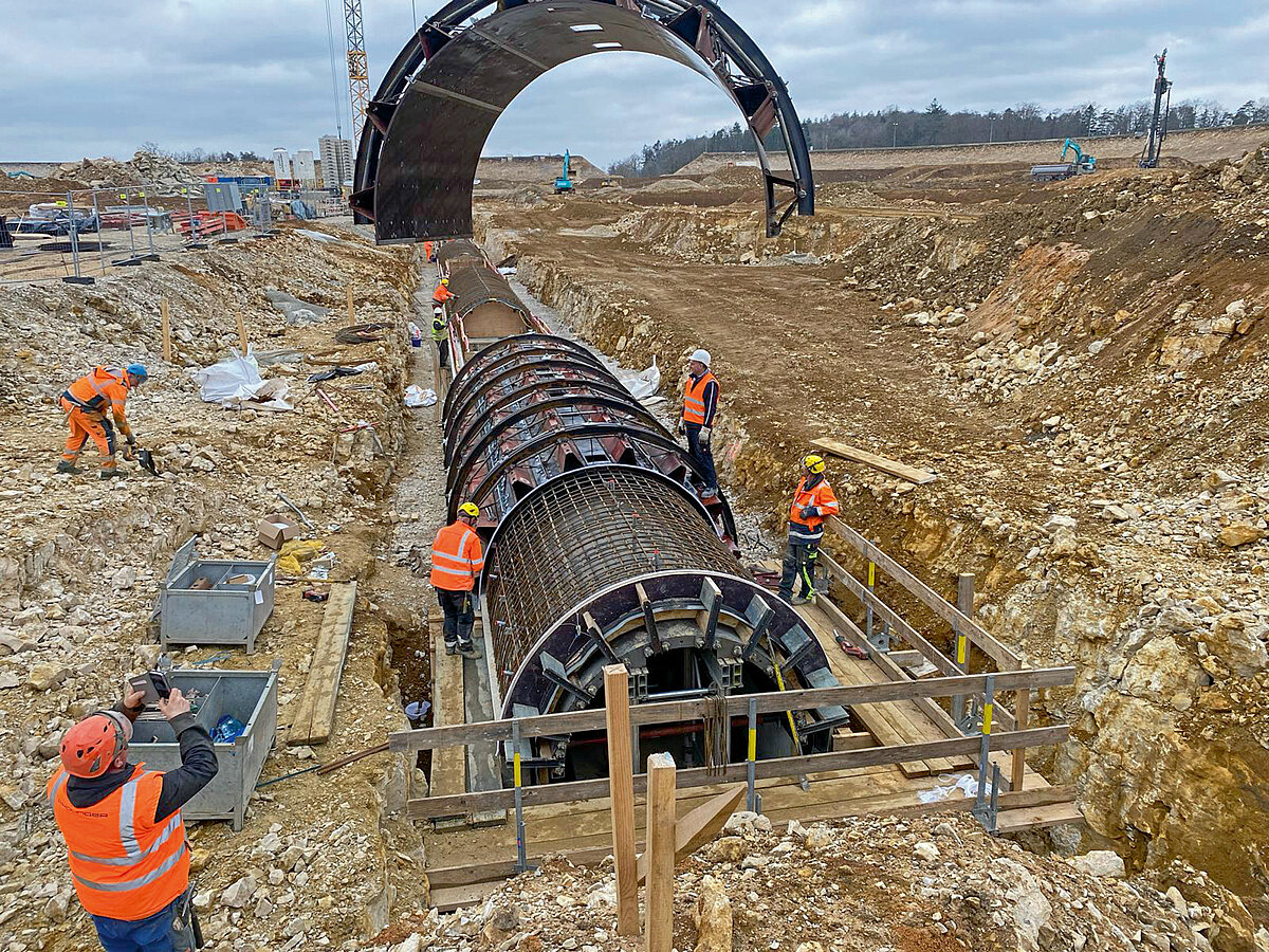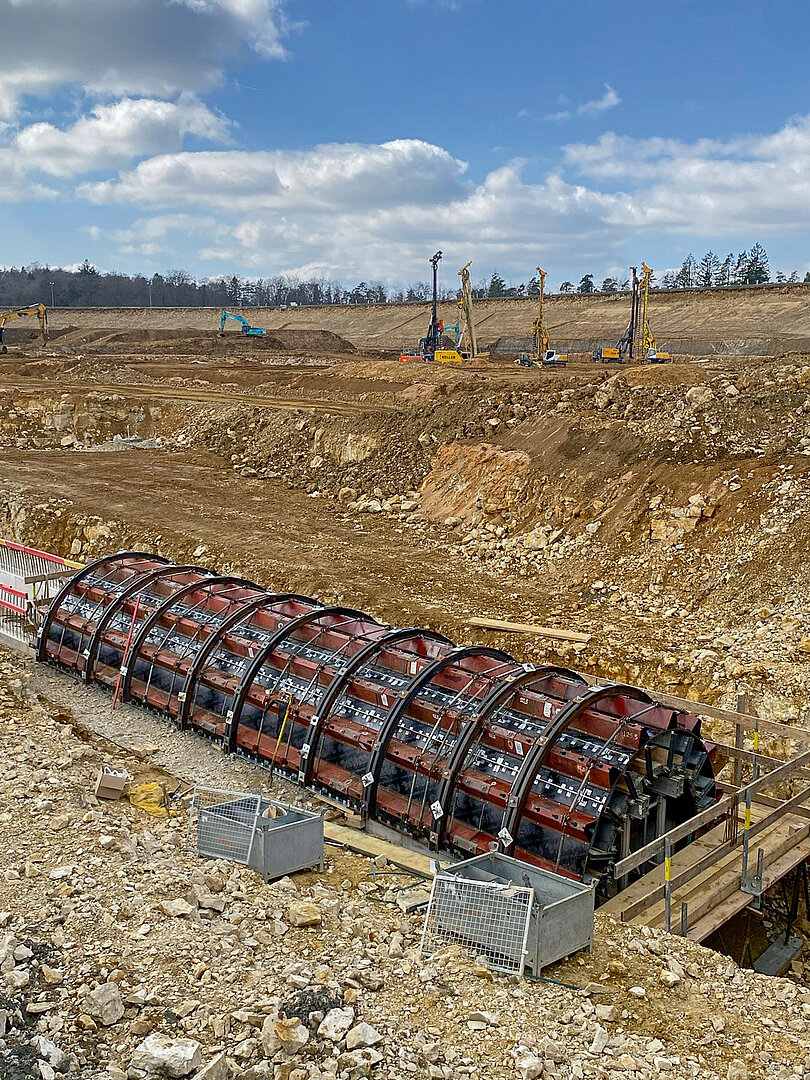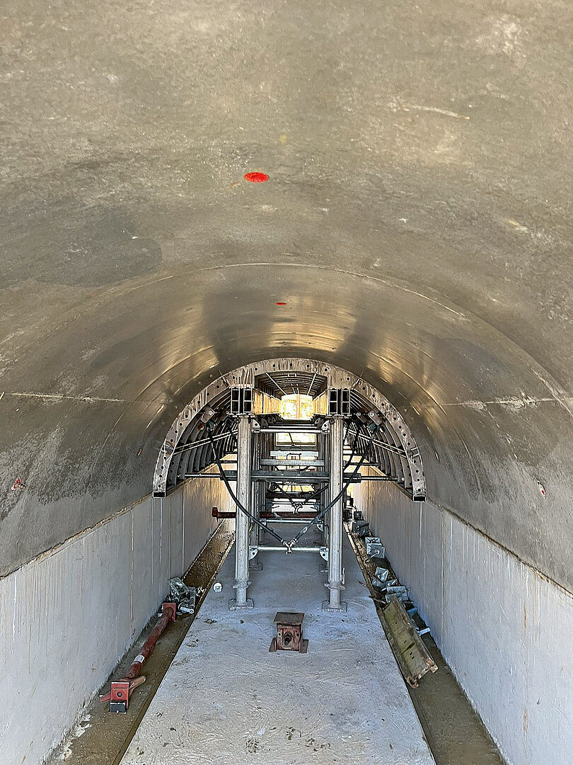 Nach dem Herstellen der Bodenplatte wurden im zweiten Betonierabschnitt die 1 m hohen Seitenwände erstellt, bevor dann abschließend der halbkreisförmige Tunnelbogen mit einem Durchmesser von 2,20 m aufgesetzt wurde. Alle Bauteile haben eine Dicke von 40 cm. Die Innenschalung des Bogens wurde bei Paschal als Sonderschalung in Stahlausführung entwickelt, die zum Ausschalen und Absenken mit Gelenken ausgestattet war. Als abstützende Unterkonstruktion wurden Stützen, Rahmen und Jochträger des Traggerüsts »Gass« verwendet, die als Serienteile mietbar sind, ebenso wie die radienverstellbare Trapezträger-Rundschalung, die als Außenschalung im Einsatz war.