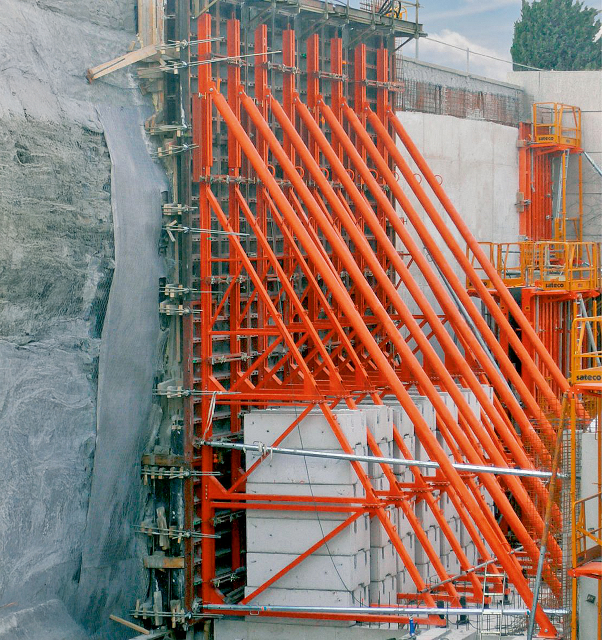 Beim einhäuptigen Betonieren werden die Frischbetondruckkräfte effektiv vom Schalungselement auf den Stützbock übertragen. Diese Kraftübertragung ist entscheidend, um die Schalung während des Betonierprozesses zuverlässig zu stabilisieren und Verformungen oder Schäden zu vermeiden: Die aufgenommenen Kräfte werden zielgerichtet über einbetonierte Anker in die Bodenplatte oder das Fundament abgeleitet. Die Verbindung von Stützbock und Schalungselementen über Systemteile bietet eine stabile Einheit. Diese kann vormontiert werden und lässt sich taktweise als Ganzes umsetzen. Integrierte Spindeln im Stützbock ermöglichen eine exakte Ausrichtung. So lassen sich auch komplexe Geometrien wie z. B. Ecken effizient und sicher schalen. Paschal bietet eine breite Palette an Stützböcken für unterschiedliche Anforderungen: Der »Flixstop« ist ideal für Schalhöhen bis 90 cm, während der »Multigurt«, ein 140 cm langer Stahlriegel aus dem »Logo«-Programm, in Kombination mit Systemteilen den Aufbau eines neigungsverstellbaren Stützbocks bis zu 2 m Höhe ermöglicht. Starre Stützböcke mit 3 bzw. 4 m Höhe decken größere Anforderungen ab. Der 4-m-Stützbock lässt sich dabei mit Unterstockteilen auf 6 bzw. 8 m erweitern.