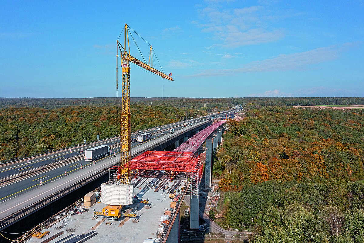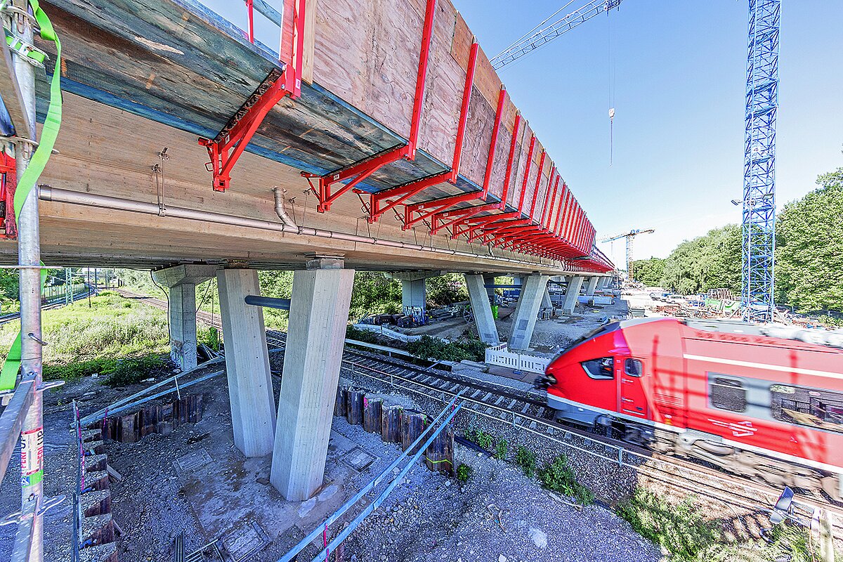Ein weiterer Anwendungsfall: das »Variokit«-Freivorbaugerät (»VBC«), das zum Einsatz kommt, wenn der Überbau einer Brücke in Ortbetonbauweise ohne Hilfsunterstützung im darunterliegenden Raum realisiert werden muss. Das System ist hydraulisch verfahr- sowie ausrichtbar und benötigt dabei nur zwei Verankerungen pro A-Rahmen. Das bedeutet: minimale Durchdringungen und ein schneller und reibungsloser Baufortschritt. Zudem erlaubt das hochtragfähige System große Betonierabschnitte von bis zu 5,75 m, was eine kürzere Gesamtbauzeit möglich macht. Technisch wegweisend ist außerdem die innovative und unten fahrende »Variokit«-Kragarmbahn (»VCT«). Speziell entwickelt für die Herstellung der Fahrbahnplatte von Stahlverbundbrücken wird die »VCT« am Tragwerk aus Stahl befestigt, sodass alle Arbeiten von oben und frei von Störungen, etwa in Form von Durchdringungen oder Fahrschienen eines Verbundschalwagens, erfolgen können. Das verbessert die Qualität der Brücke – und sorgt gleichzeitig für Effizienz: So können die Betonierarbeiten für die Fahrbahn deutlich schneller abgeschlossen werden. Gerade bei Strecken mit viel Verkehr ist das ein entscheidender Vorteil.