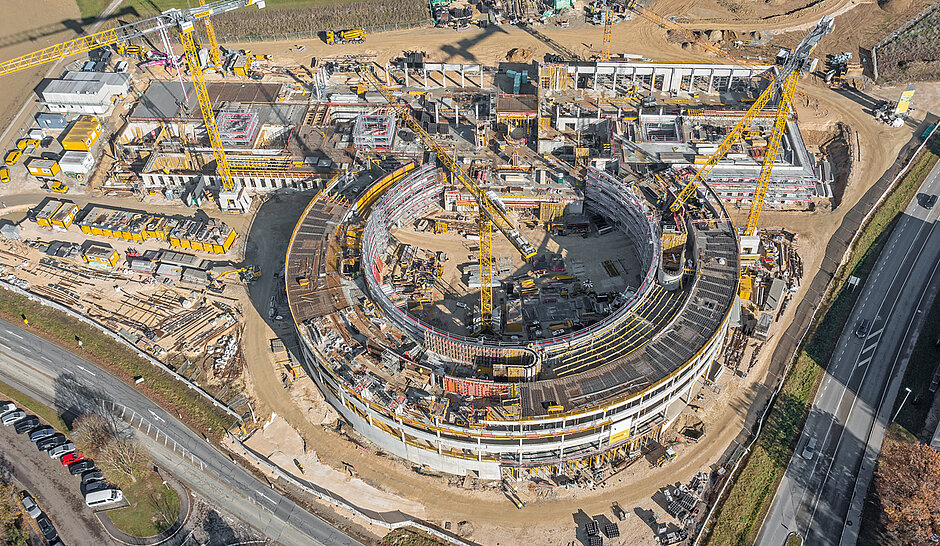 Stolze 90 m beträgt der Durchmesser des Kreisbaus, der auf drei bis vier Etagen verteilt die Unterrichtsbereiche und die Aula beinhaltet. Der begrünte Innenhof wird zum Mittelpunkt des Campusgebäudes, das sich zur Stadt hin über einen großzügigen Eingangsbereich öffnet. Entsprechend rund geht es auch im Gebäudeinneren weiter, hier bestimmen zudem Sichtbetonflächen die Gebäudearchitektur. Ob mit der Maximo Rahmenschalung und der Rundflex Rundschalung für gerade und runde Stahlbetonwände, mit der Rapid Säulenschalung für Ortbetonstützen oder der Multiflex Träger-Deckenschalung für die Geschossdecken: Für jede Aufgabe wurde gemeinsam ein stimmiges Lösungskonzept erarbeitet. Multiprop Alu-Deckenstützen und Peri Up Stütztürme kamen als geeignetes Tragsystem zum Einsatz, ASG Arbeitsbühnen und der Prokit Seitenschutz sorgten für einen konsequent hohen Sicherheitsstandard.