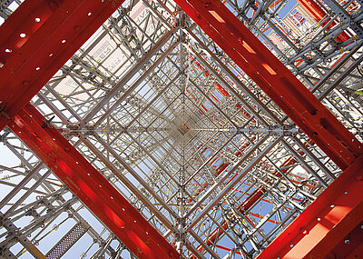 Wo sinnvoll, ergänzten projektspezifische Sonderlösungen den Peri Systemeinsatz. Beispielsweise dienten Sonder-Deckentische auf Basis der Variodeck Stahlriegel-Deckentische gleichermaßen als Arbeitsbühne und Auflagerkonstruktion für die runden Fertigteilbrüstungen. Und mittels aufgedoppelter Knaggenkästen auf den Maximo Struktur Wandschalungselementen ließen sich runde Wände maßgenau und in sehenswerter Sichtbetonqualität herstellen. Die Maximo sorgte dabei nicht nur für optisch attraktive Betonoberflächen, mit ihrer einseitig bedienbaren MX Ankertechnik beschleunigte sie zudem auch die Arbeitsabläufe.s