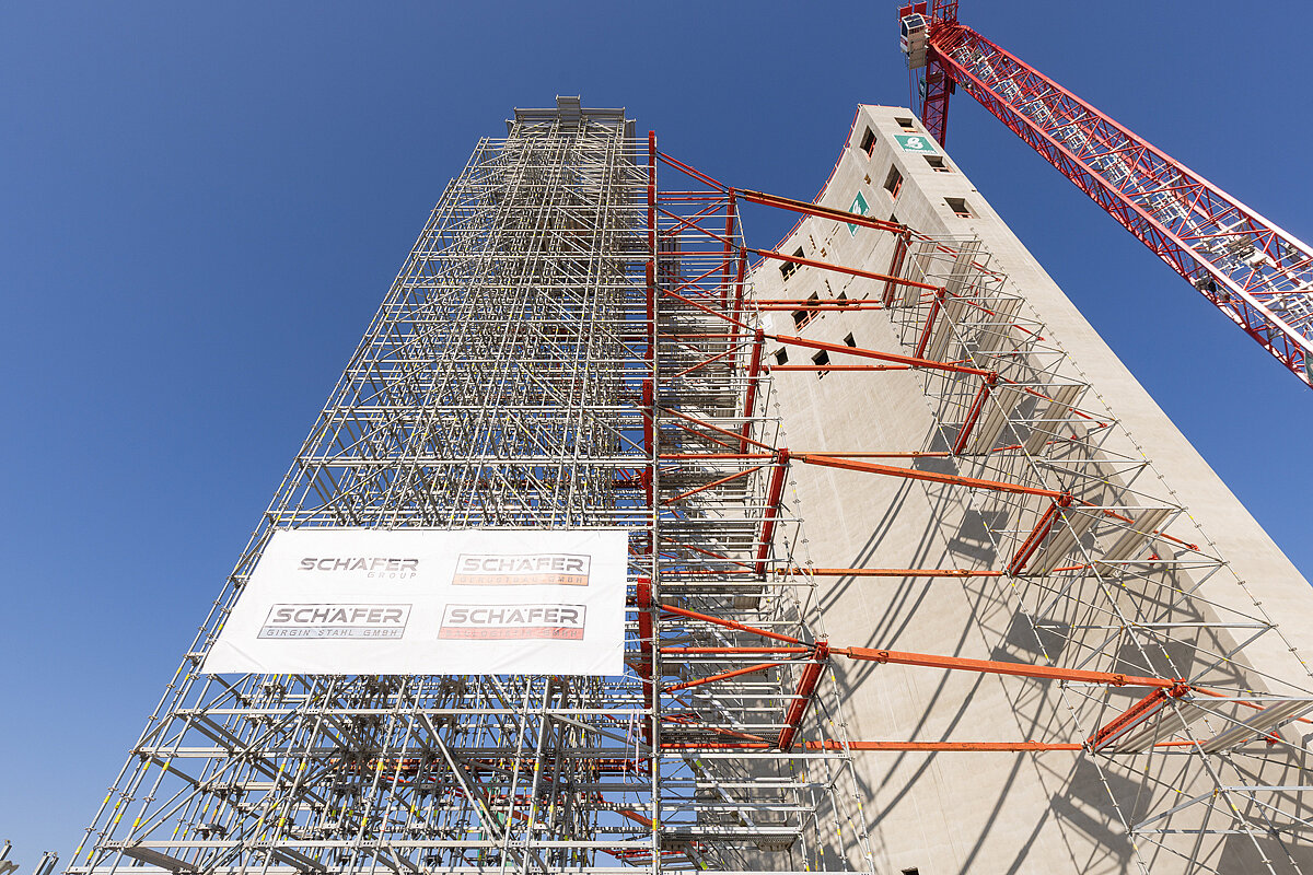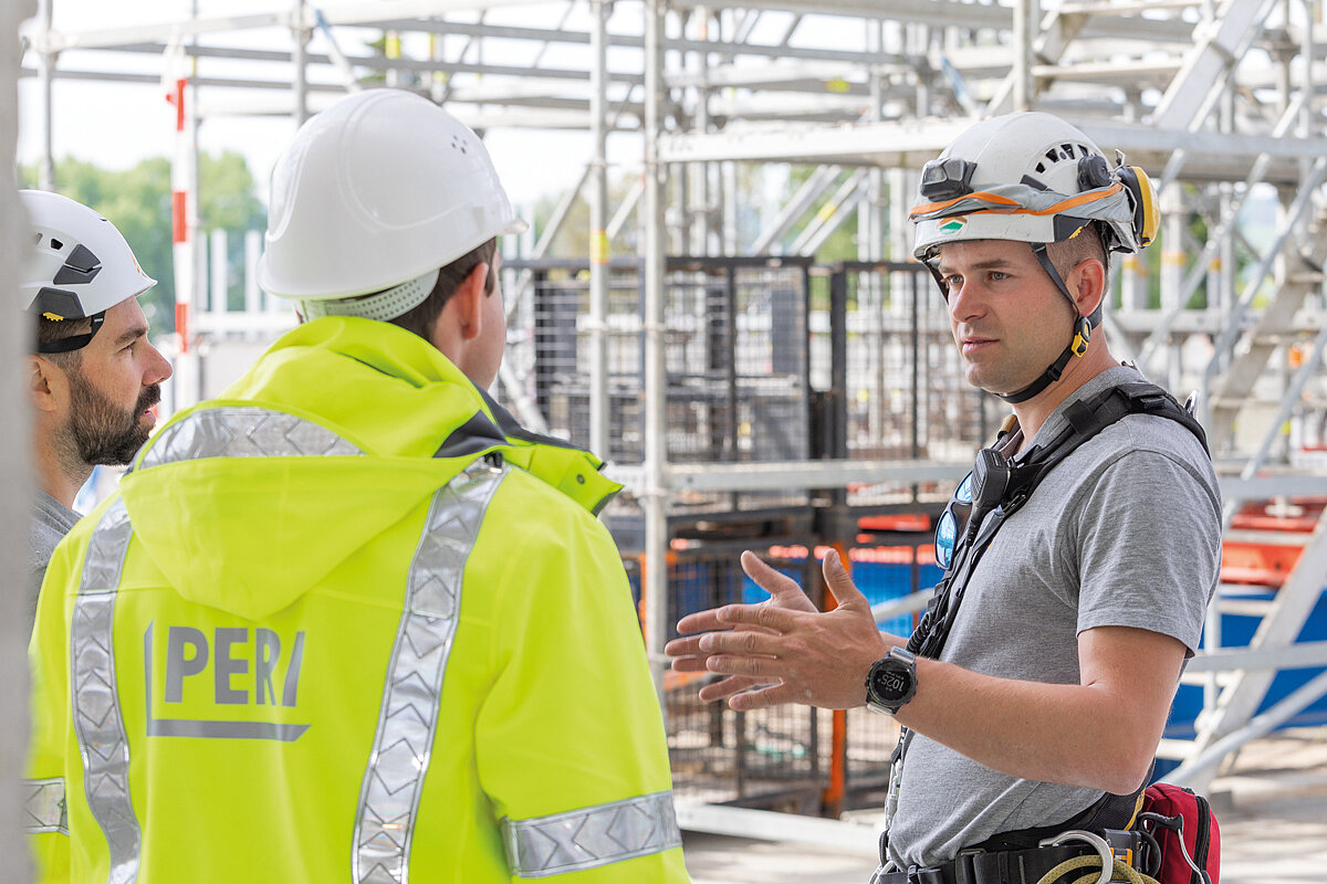 Das Erfolgsrezept für dieses außergewöhnliche Bauvorhaben beruhte sicherlich auf einer Kombination aus funktionierendem Teamwork und Systemvorteilen der eingesetzten Produkte. So wurden die Ideen und Anforderungen der Gesamtbauleitung unter Mike J. Vivas Y Kerner und des Holzbauunternehmens Blumer-Lehmann von Peri Ingenieuren in eine praxistaugliche, statisch abgesicherte Gerüstlösung überführt und nach gemeinsamer Abstimmung von den Gerüstspezialisten der Schäfer Gerüstbau GmbH vor Ort in die Realität umgesetzt.