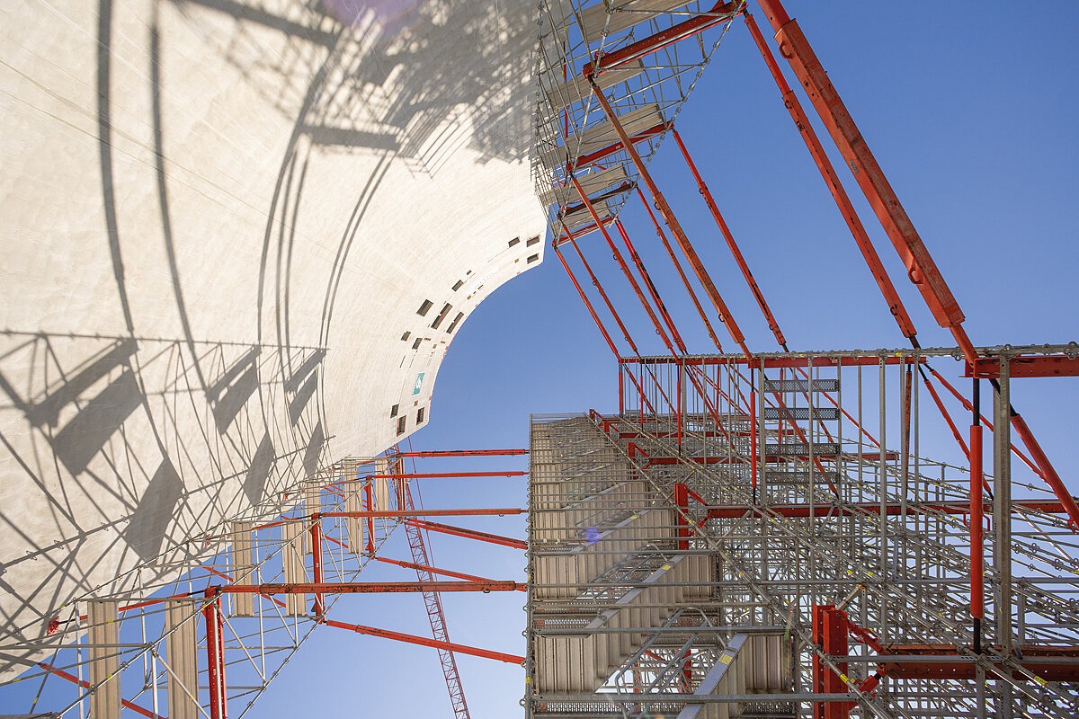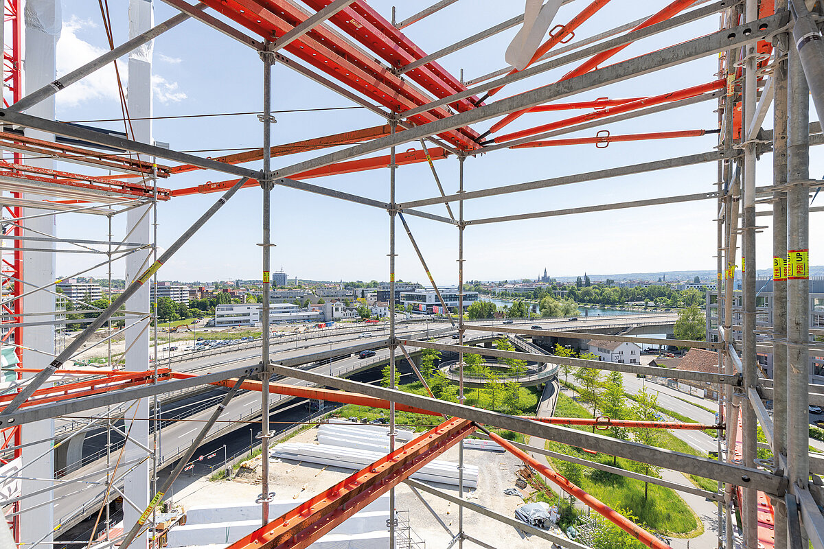 Ein Peri Up Trag- und Montagegerüst diente von März bis Juli zur Errichtung des Holztragwerks. Die Herausforderung war, hohe Lasten in großer Höhe temporär abzutragen – verbunden mit der Maßgabe eines möglichst geringen Platzbedarfs. Unter der Berücksichtigung hoher Windlasten konstruierten die Weißenhorner Peri Gerüstspezialisten eine 32 m hohe Gerüstlösung auf Basis des Peri Up Gerüstbaukastens, um die Deckenkonstruktion aus radial angeordneten Holzfachwerkträgern auflegen und montieren zu können. Mittels Systembauteilen des Variokit Ingenieurbaukastens wurden fünf Aussteifungsebenen ausgebildet, die Horizontallasten konnten dabei zuverlässig in den außenliegenden Stahlbetonkern abgeleitet werden. Gleichzeitig hielt die trotz der rund 1.400 kN Traglast äußerst schlank ausgeführte Gerüstkonstruktion die Sockelebene frei für die notwendigen Hubarbeitsbühnen.