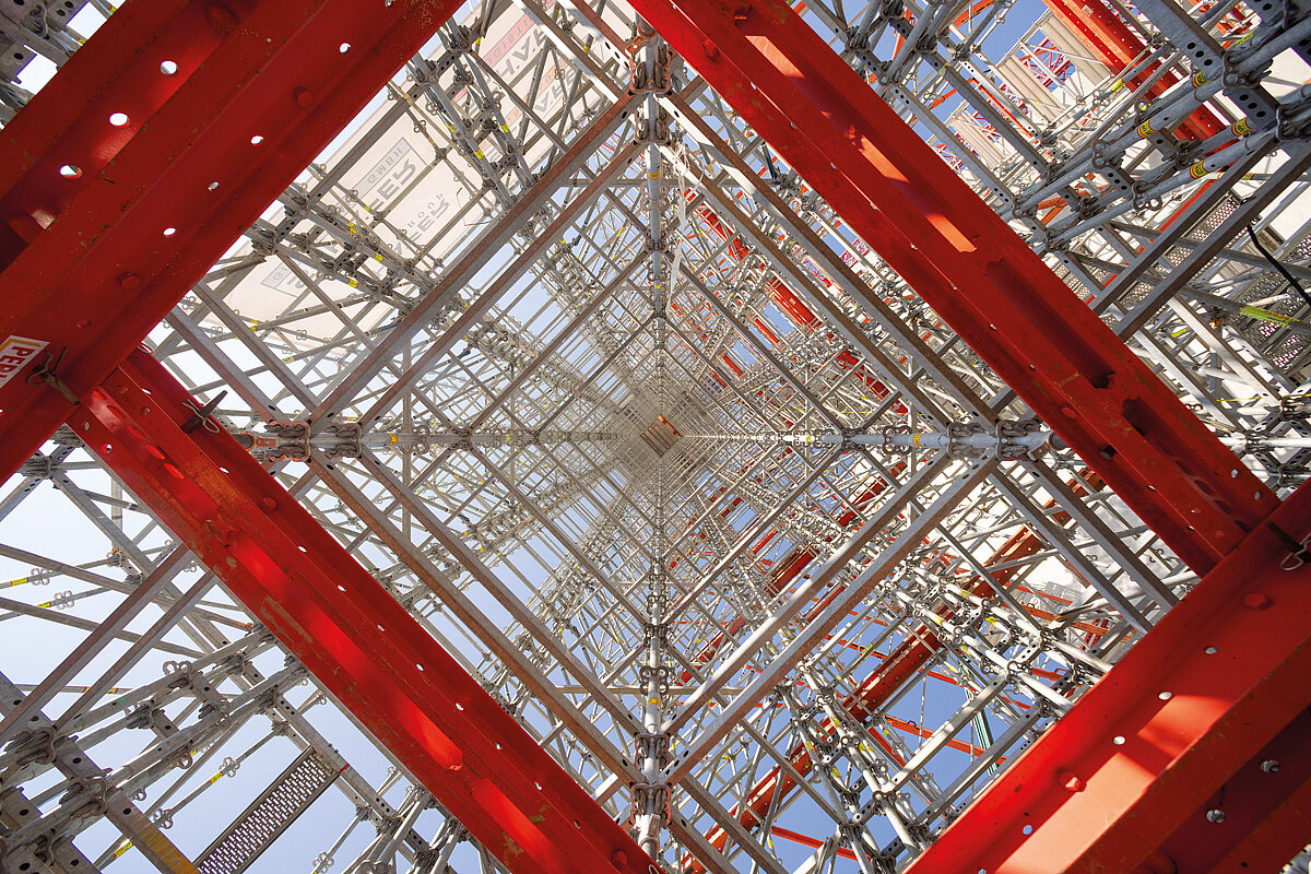 Sowohl bei Planung, Montage und Nutzung machten sich die Flexibilität und Kombinierbarkeit der beiden modularen Baukastensysteme, Peri Up und Variokit, positiv bemerkbar. Beide Systeme beruhen auf einem metrischen Grundraster und lassen sich nahezu beliebig kombinieren. Zudem konnten mittels 25-cm-Riegeln ausgebildete Schwerlaststützen übergangslos integriert werden – punktgenau dort, wo innerhalb der Tragkonstruktion hohe Lastkonzentrationen abzutragen waren. Die geometrische Anpassungsfähigkeit war ebenso dort gefragt, wo auf Basis einer exakten 3D-Gerüstplanung Kollisionspunkte zwischen der Gerüstkonstruktion und dem Holzbau ausgeschlossen werden mussten.