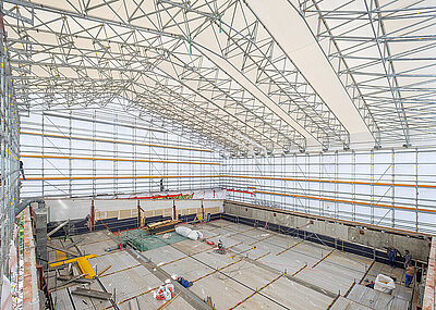 Wichtiger Bestandteil der Peri Up Gerüstlösung war auch die Möglichkeit, die Traggerüstkonstruktion und damit die mittig aufgelagerte Fachwerkdecke nach deren Fertigmontage mittels mobiler Hydraulikeinheiten kontrolliert abzusenken.