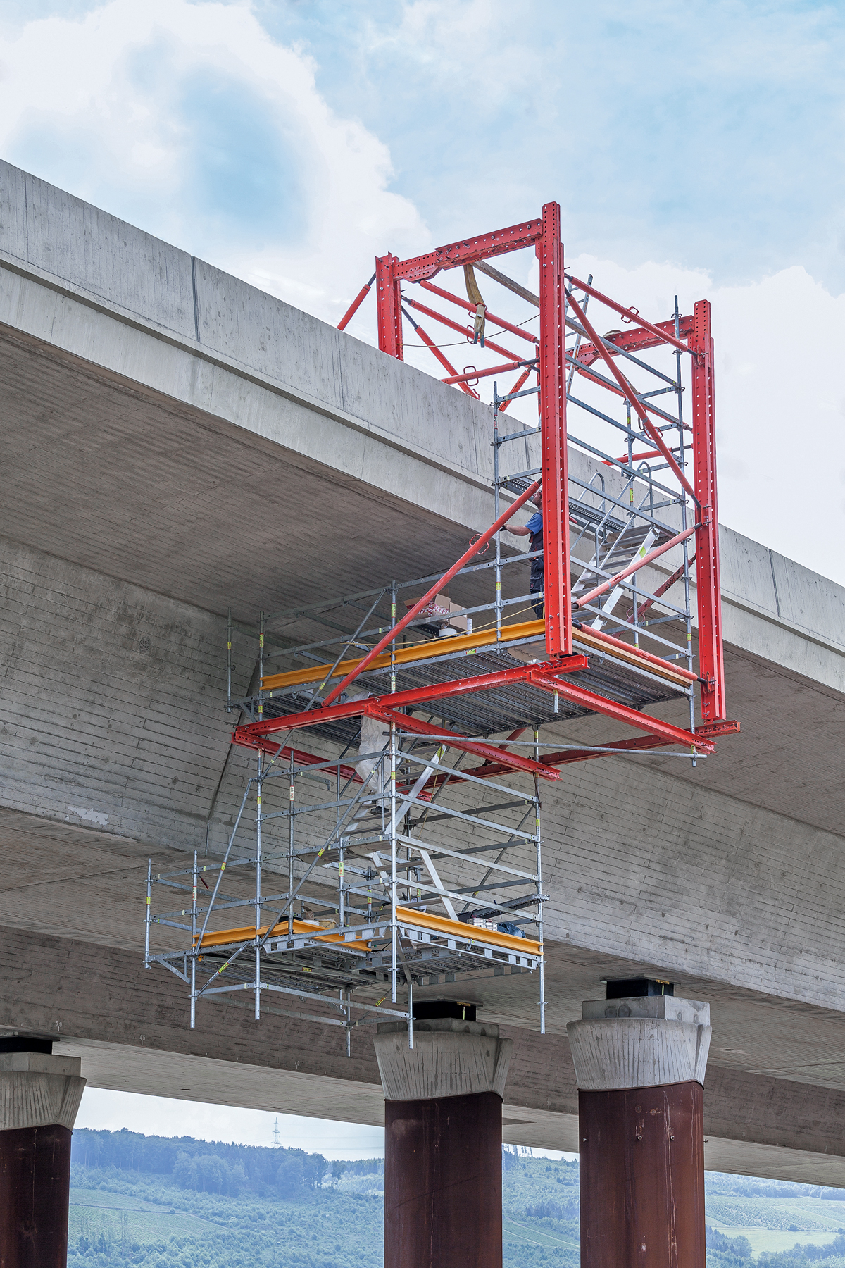 Durch die integrierbaren flexiblen Baukastensysteme und ihre funktionalen Gerüstbauteile im gleichen Raster sind herausfordernde Ingenieurbaulösungen wie Hängegerüste an Brückenbauwerken oder hohe Turmeinrüstungen ebenso umsetzbar wie Überbrückungen mit großen Spannweiten, beispielsweise über Fahrbahnen. Mit dem »Superbaukasten« können selbst anspruchsvolle Projekte wie Brücken-, Tunnel- oder Industriebauten geplant und realisiert werden.