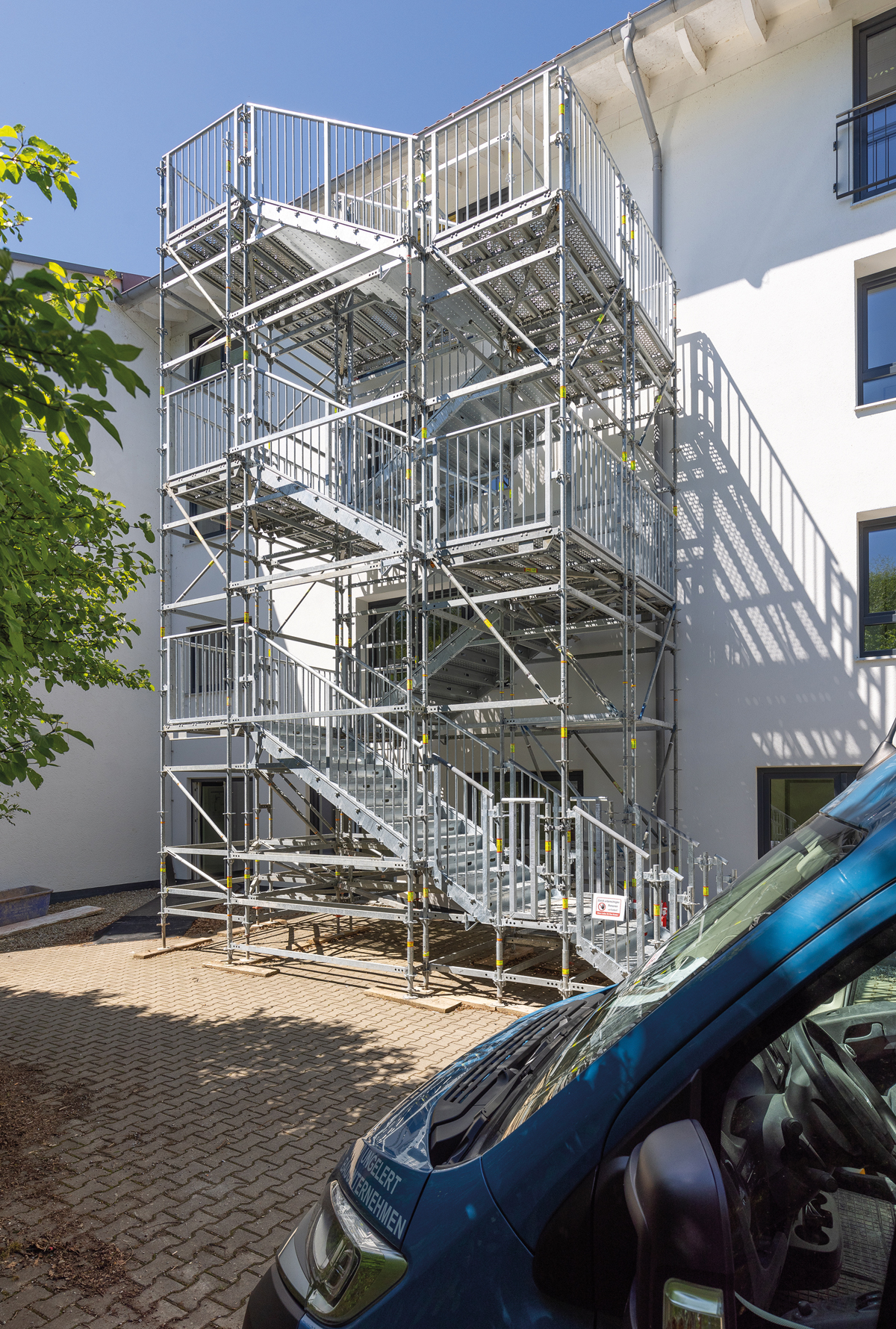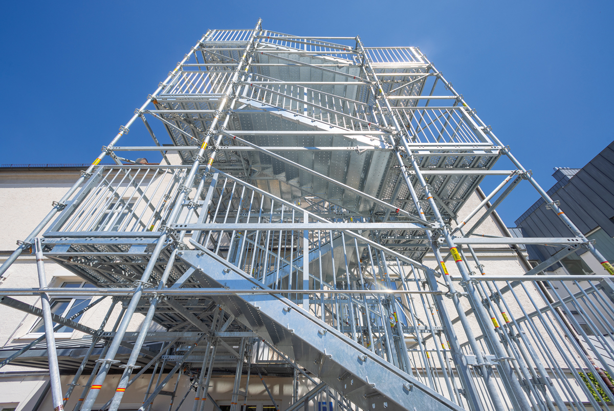 Baustellen im öffentlichen Raum stellen stets eine besondere Herausforderung dar. Hier gilt es nicht nur, eine zuverlässige Gerüst- und Zutrittslösung für das Montageteam zu schaffen – vor allem muss auch der sichere Publikumsverkehr gewährleistet werden. Häufig passieren dutzende von Passanten tagtäglich die Baustelle. Beispielsweise bei umfassenden Sanierungsarbeiten an Mehrfamilienhäusern benötigen die Bewohner dabei einen Zugang zu den verschiedenen Ebenen des Gebäudes. Ein Bauprojekt wird so schnell zum Balanceakt zwischen Sicherheit, Funktionalität und anspruchsvollen Vorschriften. Denn wenn es um Regelungen für öffentliche Treppenanlagen und Fluchtwege geht, wird es richtig knifflig: Die Vorschriften sind dabei in Bezug auf Sicherheit, Tragfähigkeit und Geometrie noch strenger als für Zugänge zu Arbeitsplätzen. Mehr als 20 Normen und Richtlinien regeln auf nationaler und europäischer Ebene den Bau von Treppen im öffentlichen Bereich, unter anderem für Fluchtwege, Bahnsteigzugänge, aber auch für Zuschaueranlagen oder im Zusammenhang mit barrierefreiem Bauen.
