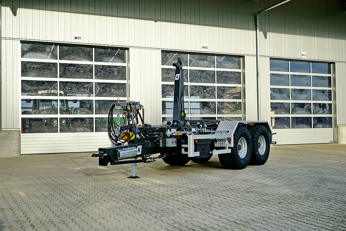 Serienmäßig ist das Modell mit einer Parabelfederung ausgestattet, alternativ stehen Verbundlenker oder Luftfederung zur Verfügung. Die Rahmenbauweise orientiert sich an den bewährten, größeren Fahrzeugtypen und garantiert damit laut Hersteller höchste Stabilität und Langlebigkeit. Der neue »RK14.55« hingegen ist für Containerlängen von 4 000 bis 5 500 mm ausgelegt und erreicht einen Kippwinkel von rund 50°. Die Rollenhöhe variiert je nach Fahrwerk und Bereifung zwischen 1 070 und 1 350 mm. Zur Wahl stehen ADR- oder Gigant-Achsen sowie unterschiedliche Bereifungsoptionen von 385/65R22,5 bis 560/60R22,5.Nach der Einführung bietet Kröger nun auch für »Agroliner«-Hakenliftanhänger eine Isobus-Steuerung an, die ab 2026 verfügbar ist. Sie ermöglicht nach Herstellerangaben eine komfortable Bedienung über das Schlepper-Terminal, über zusätzliche Isobus-Geräte oder auch per Funkfernbedienung. Automatische Abläufe, etwa beim Absetzen oder Aufziehen von Containern, sind vorprogrammiert. Mittels AUX-Funktion lassen sich einzelne Befehle auf den Fahrerhebel legen, wodurch die Steuerung sehr intuitiv wird. Auch ohne lange Einweisung ist ein sicheren Umgang mit der Technik möglich.d